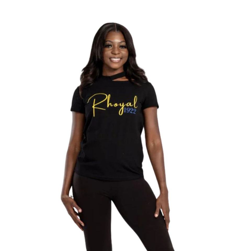 เสื้อทูนิคคอวี Rhoyal รุ่น 1922 SGRho Sorority Apparel สำหรับผู้หญิง สีดำ ผ้าฝ้าย ทันสมัย แฟชั่น เสื้อสไตล์กรีก รักษาประเพณีชีวิต ชุดลำลอง เสื้อยืด