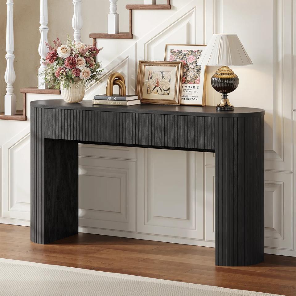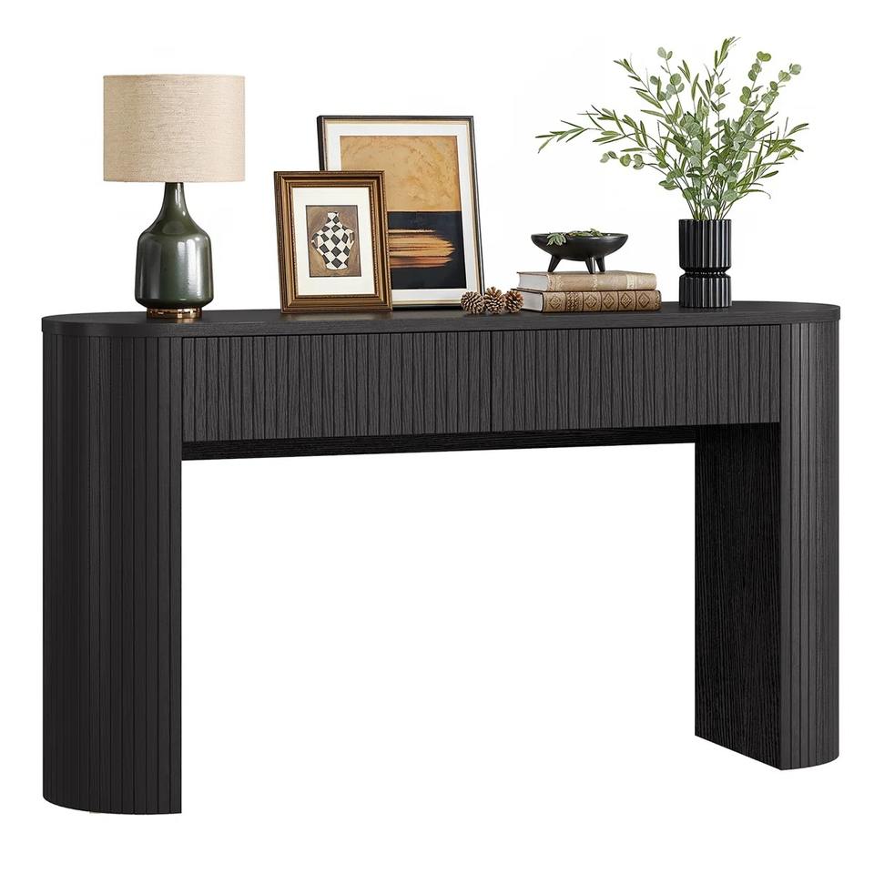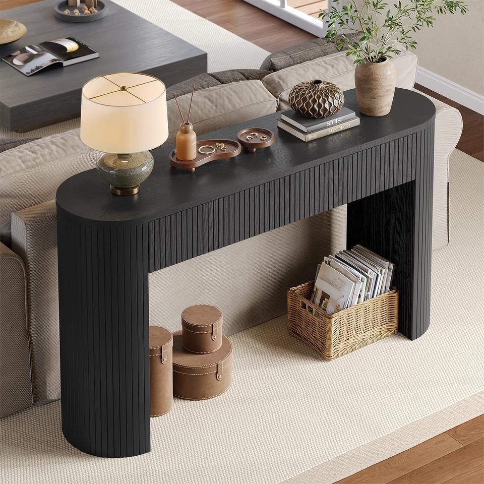 โต๊ะโซฟาดีไซน์ทันสมัยลายริ้ว พร้อมด้านข้างโค้งมนและโครงเหล็กสีดำด้าน สำหรับใช้ในห้องนั่งเล่นและโรงแรม