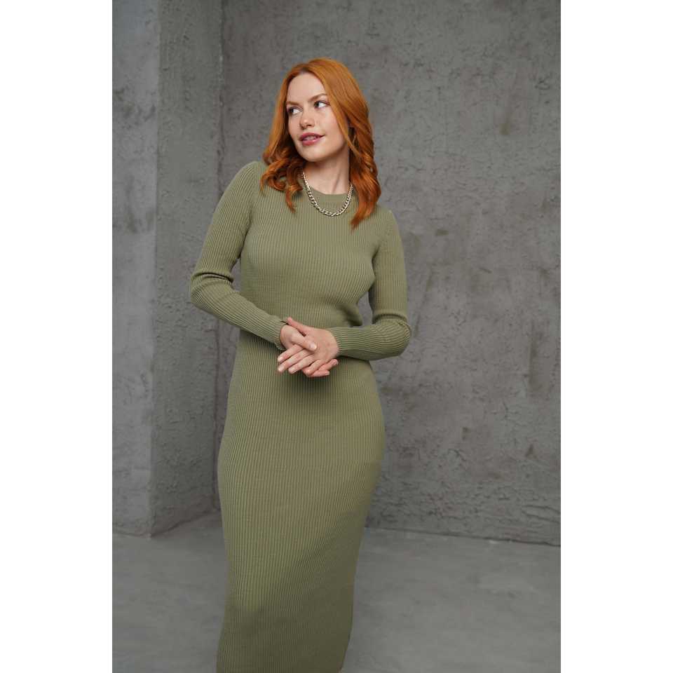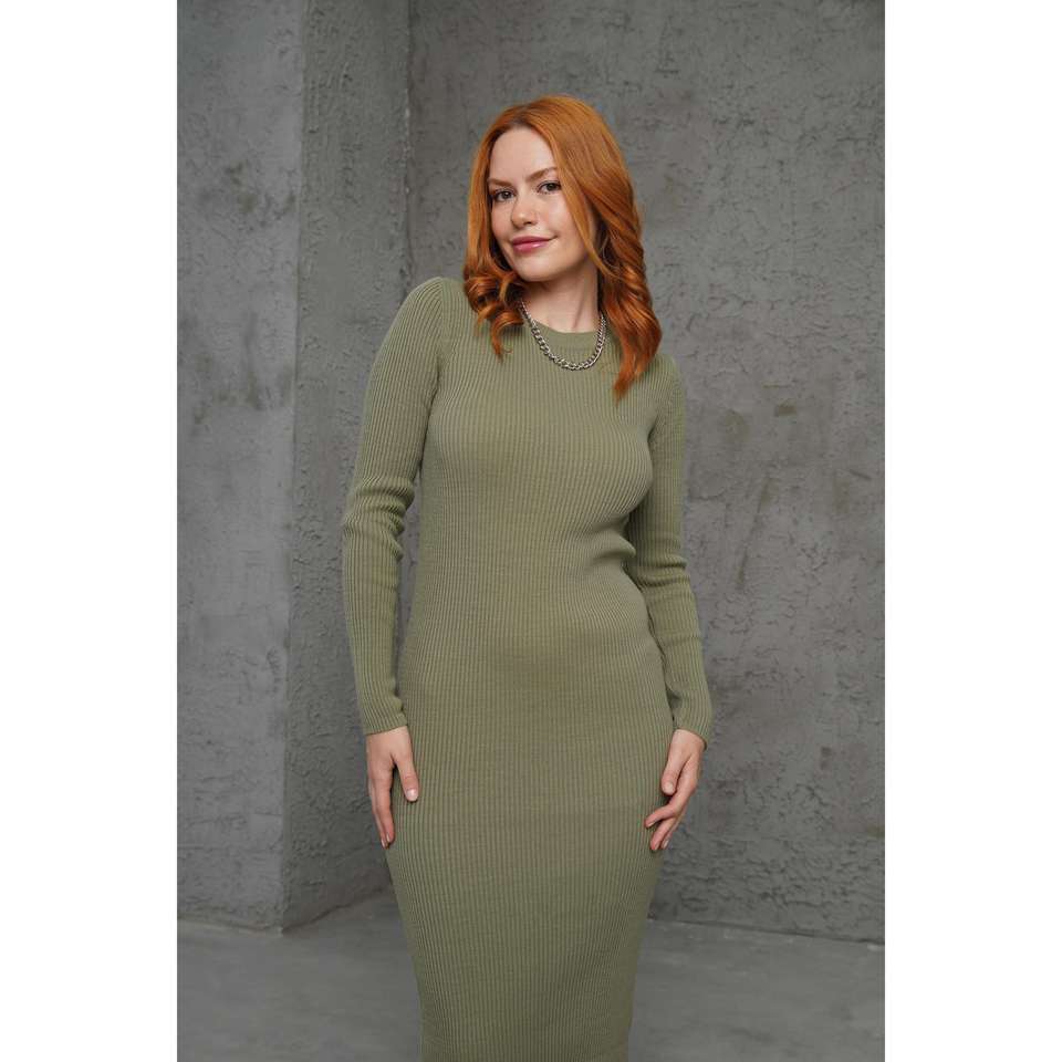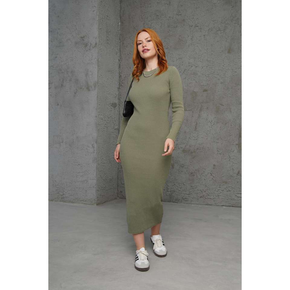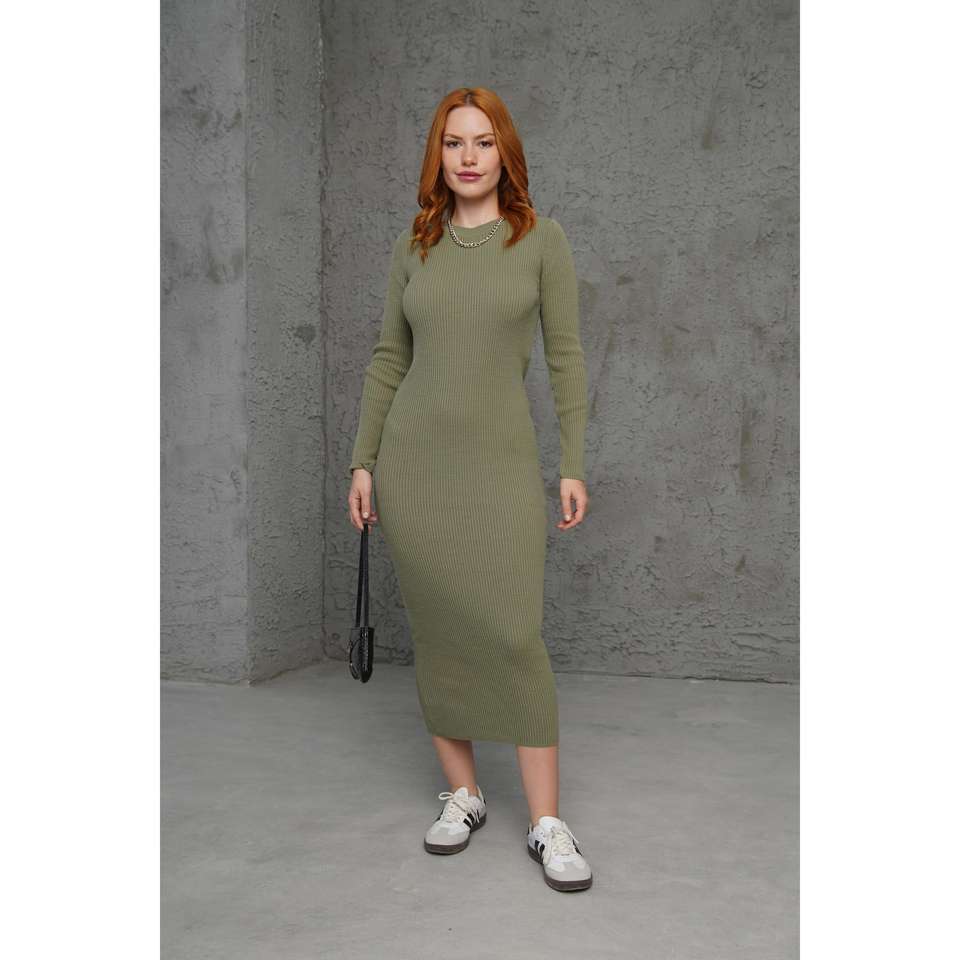 เดรสทรงเข้ารูปผ้าถักลายริบ สีกากี คอกลม เอวธรรมชาติ สวมใส่สบายๆ ระบายอากาศได้ดี แขนยาว ความยาวปานกลาง
