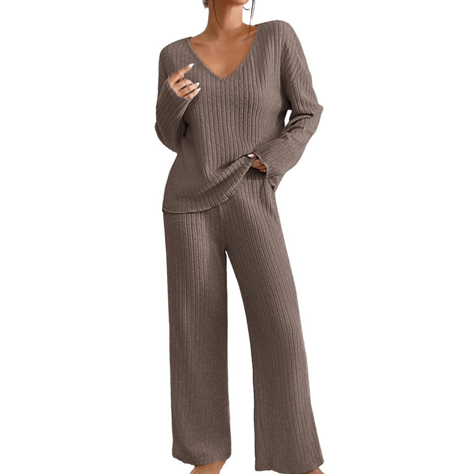 ชุดเซ็ตสองชิ้นสำหรับผู้หญิง ผ้าถักลายริบ เสื้อแขนยาวคอกลม กางเกงขายาวเอวสูงทรงขากว้าง สไตล์ลำลองสำหรับฤดูใบไม้ร่วง