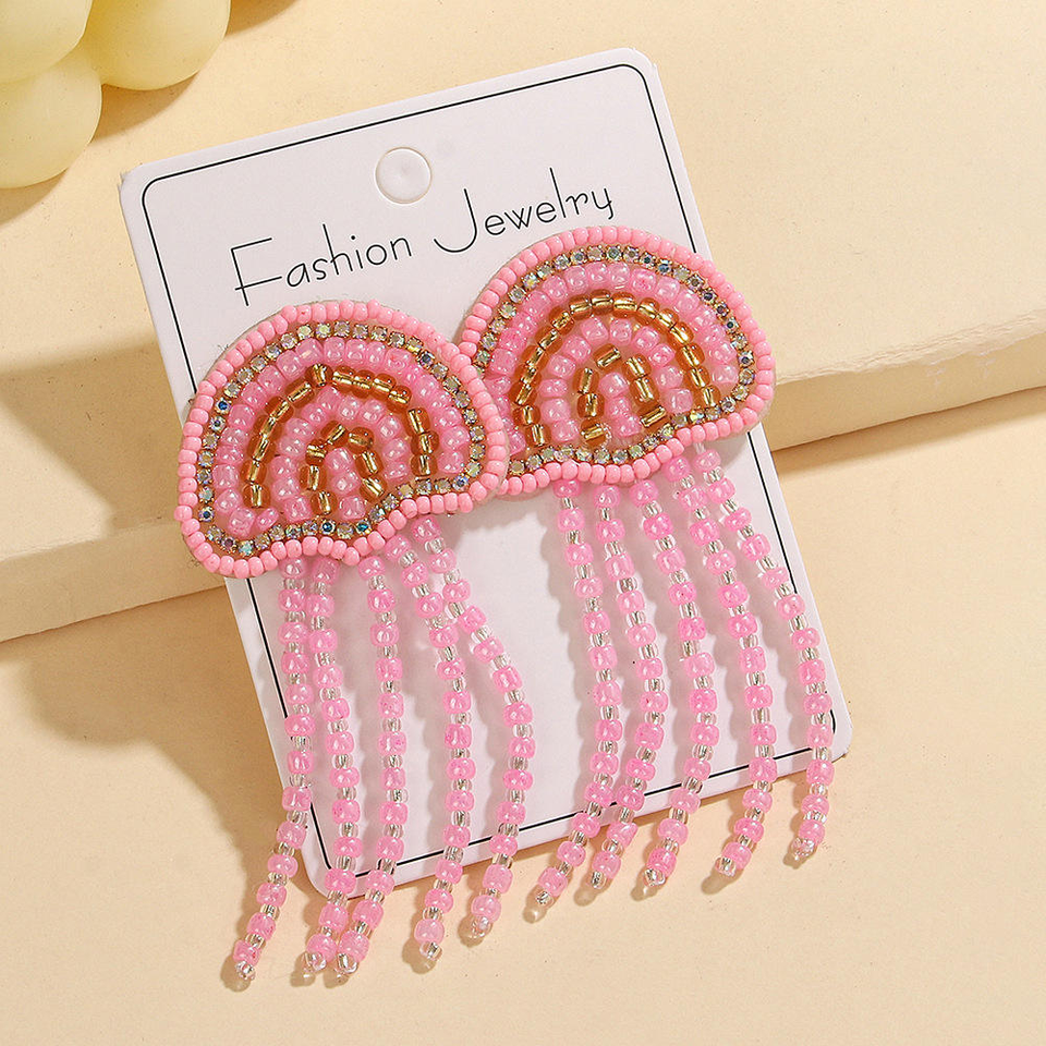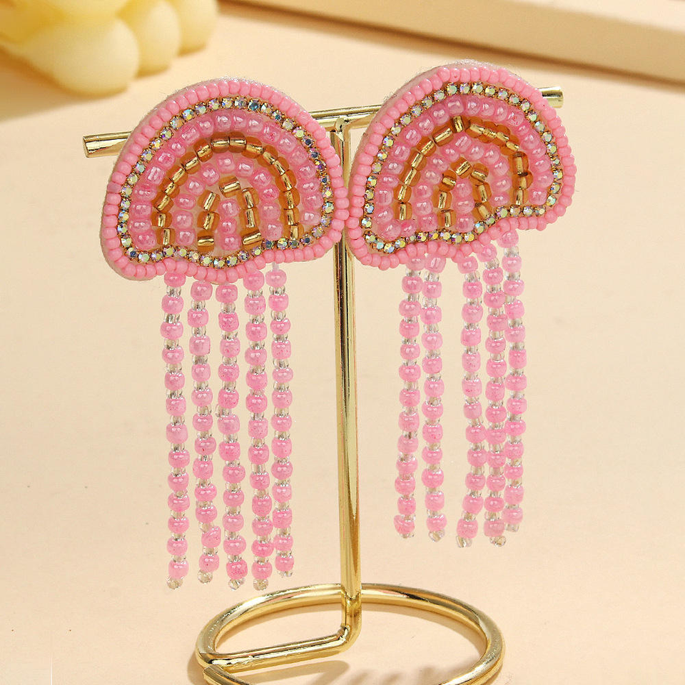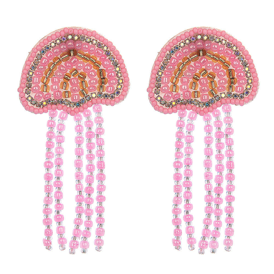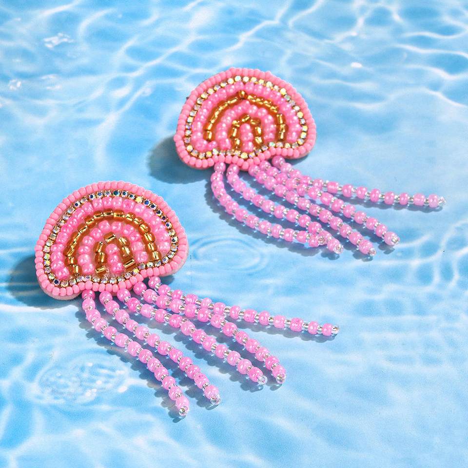 ต่างหูพู่ประดับเปลือกหอยรูปแมงกะพรุนสีชมพูสไตล์ทะเลฤดูร้อน งานฝีมือจาก MD HANDICRAFTS