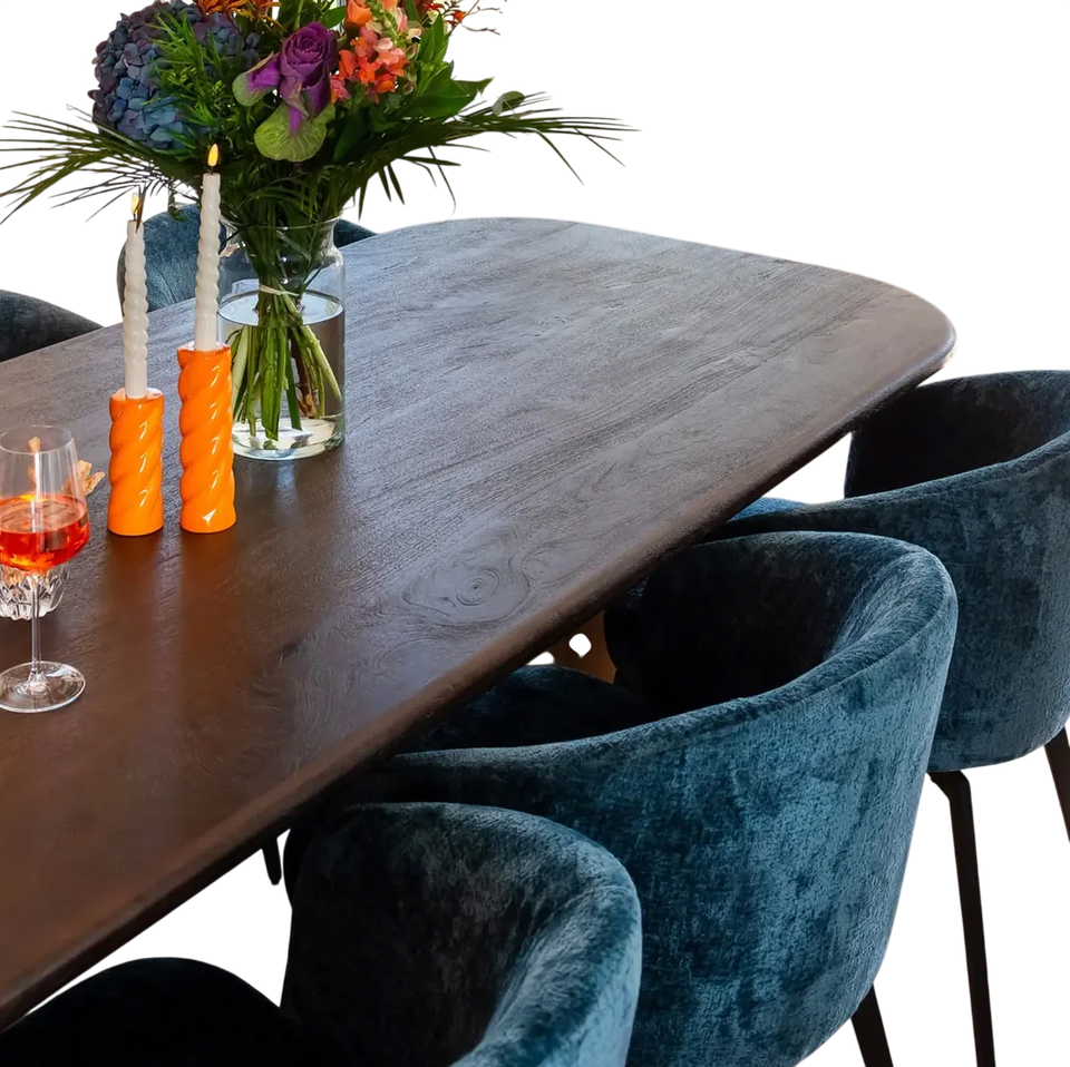 โต๊ะรับประทานอาหารทรงแปดเหลี่ยมหรูหรา ท็อปไม้มะม่วงเนื้อแข็งสีน้ำตาล พร้อมฐานโลหะสีทอง 2 ขา ดีไซน์ทันสมัย เหมาะสำหรับห้องครัวในวิลล่า