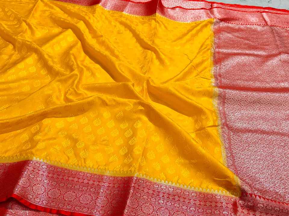 ผ้าไหมสีแดงเข้มลายโบรเคด พร้อมขอบปักดิ้นเงิน งานทอแบบดั้งเดิมจากเมืองบานาราสี ป้องกันแสงแดด เหมาะสำหรับงานแต่งงานและงานเฉลิมฉลอง
