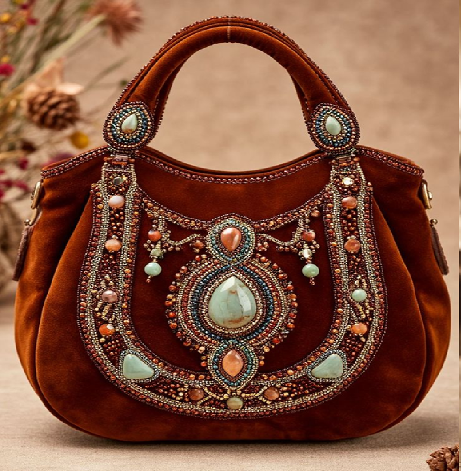 กระเป๋าถือกำมะหยี่สีน้ำตาลเข้ม ประดับด้วยหินสีเขียวขุ่นอย่างหรูหรา มีจำหน่ายในราคาขายส่ง