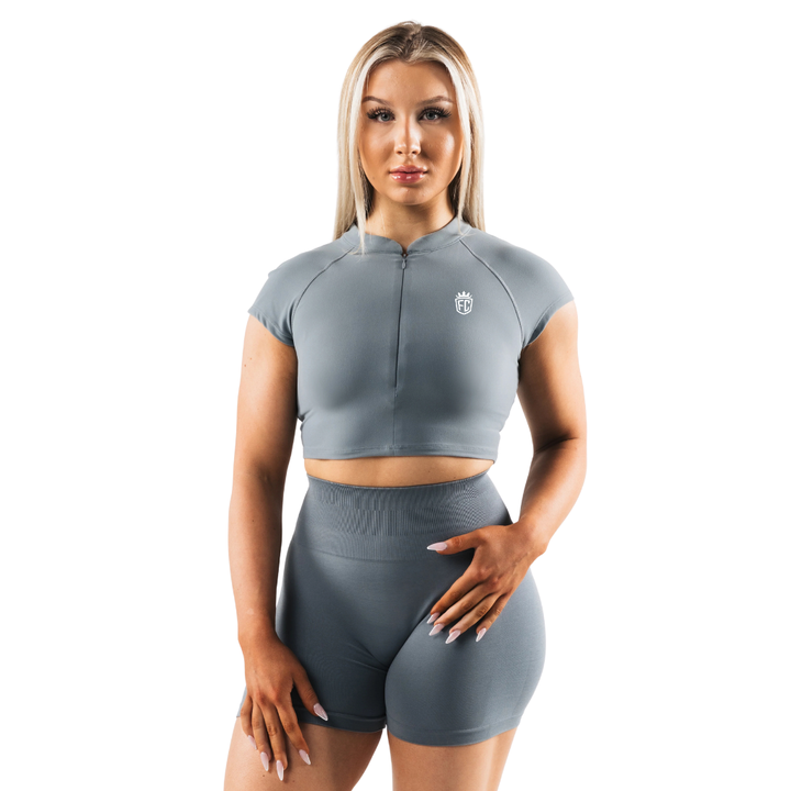เสื้อชั้นในกีฬาผู้หญิงสีเทาแบบมีซิปด้านหน้า แขนสั้น ไร้ตะเข็บ ยืดหยุ่นได้ เหมาะสำหรับโยคะ ฟิตเนส ออกกำลังกาย เสื้อครอปท็อป