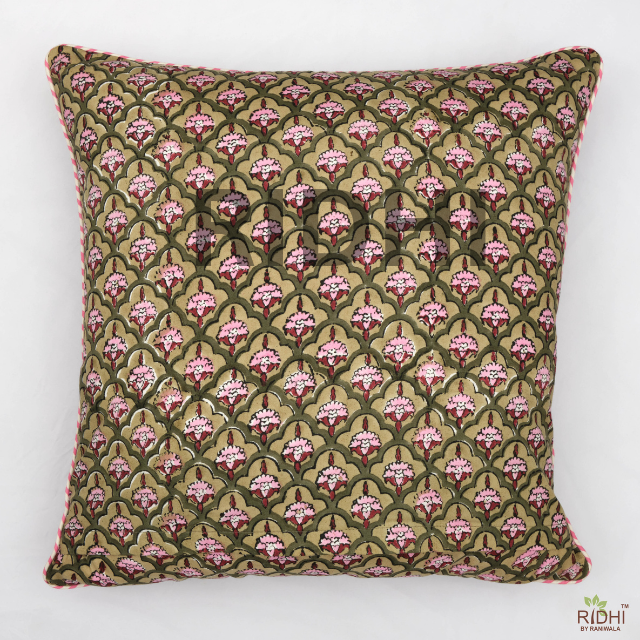 ปลอกหมอนอิงผ้าฝ้ายแท้ 100% ลายดอกไม้สีเขียวและชมพู งานแฮนด์เมด Ridhi พร้อมขอบปักลายบล็อกพิมพ์ ใช้ซ้ำได้สำหรับห้องนอน โซฟา ห้องรับแขก