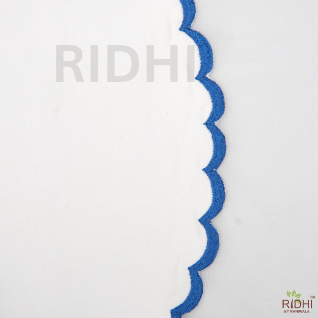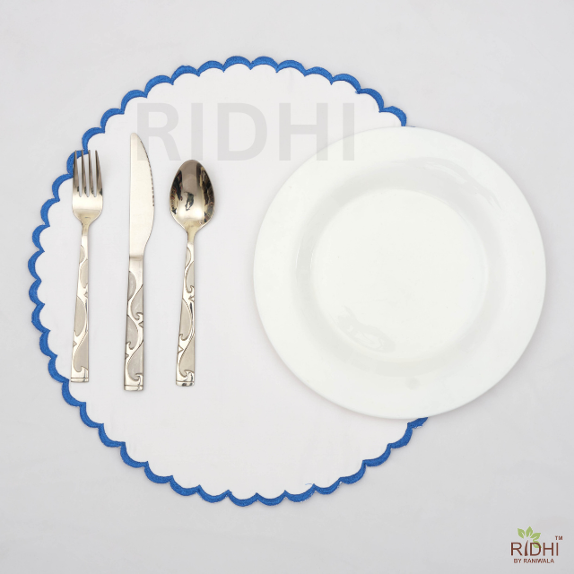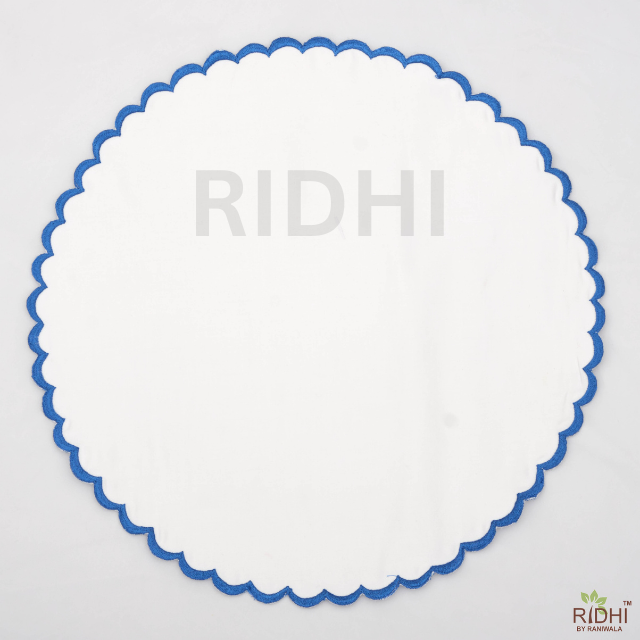แผ่นรองจานทำมือจากผ้าฝ้ายสีขาวของ Ridhi พร้อมลายปักสีน้ำเงิน พิมพ์ลายบล็อก ผ้าฝ้ายแท้ 100% ของตกแต่งโต๊ะอาหาร แผ่นรองจานนำกลับมาใช้ใหม่ได้
