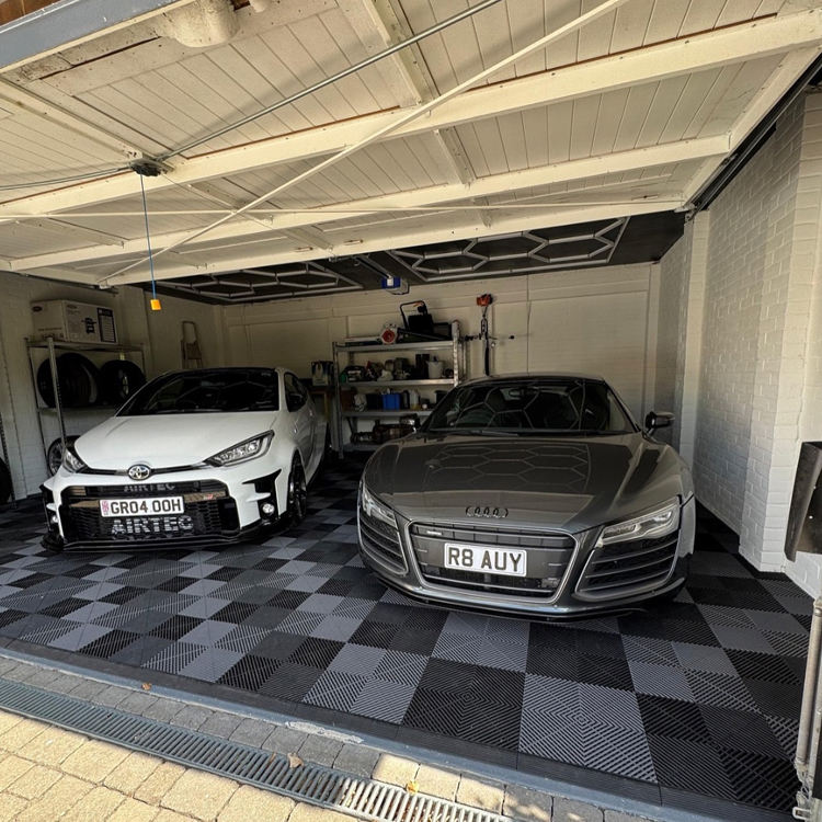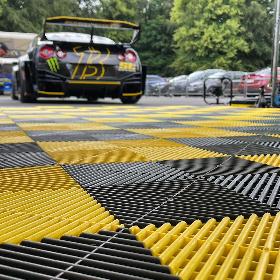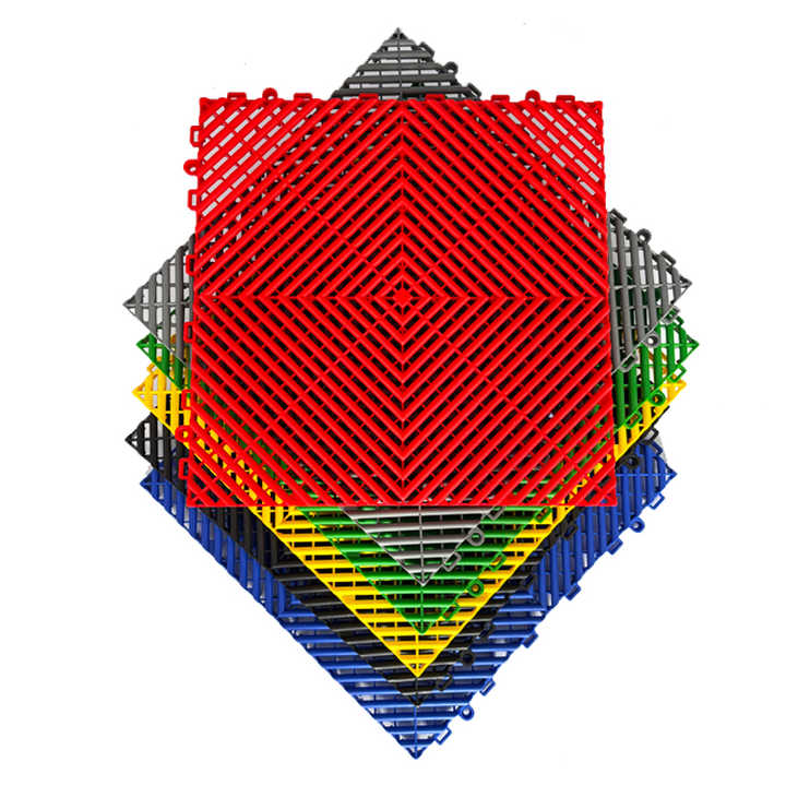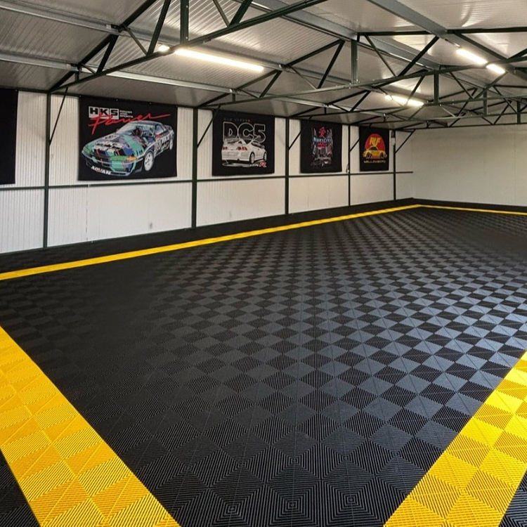 กระเบื้องปูพื้นโรงรถพีวีซีสำหรับตกแต่งแบบแยกส่วนแบบแข็งสำหรับพื้นรถรายละเอียดร้านค้าปูพื้นโรงรถ