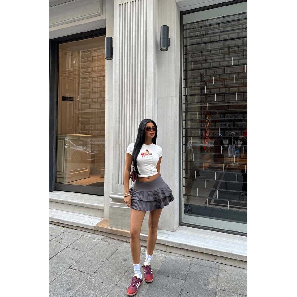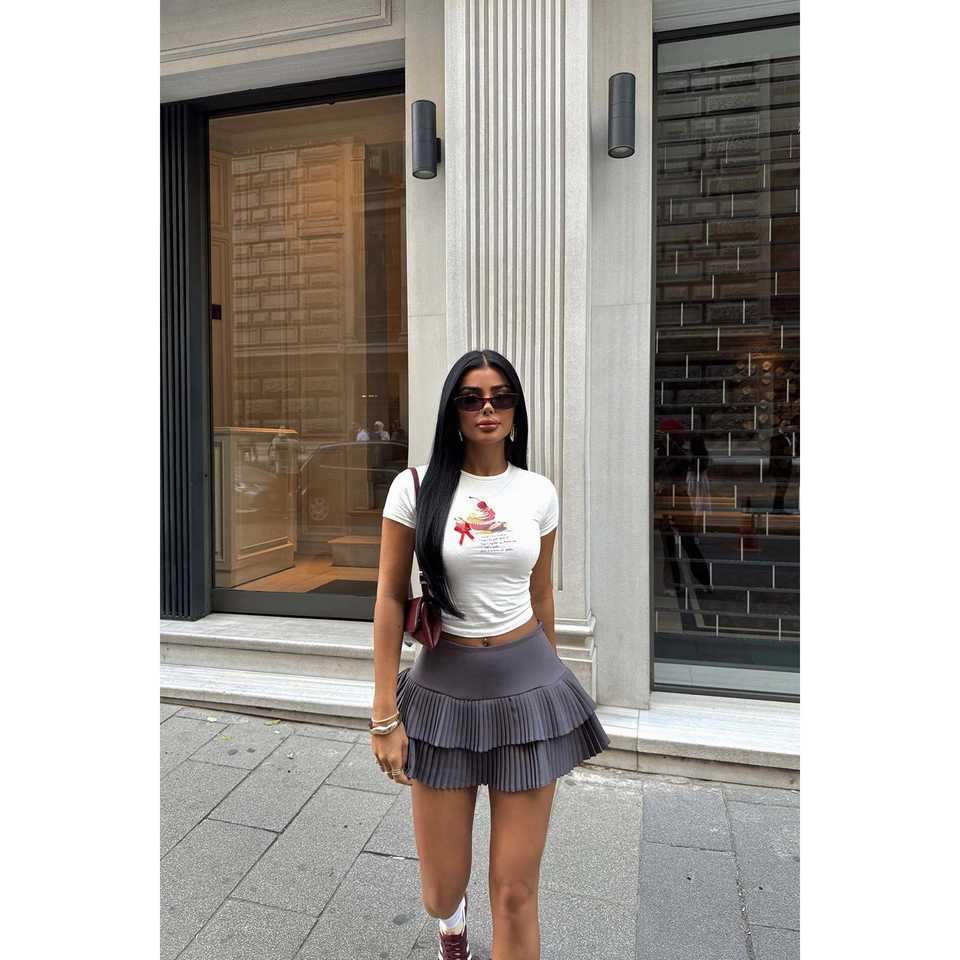 กระโปรงสั้นสไตล์ลำลองสำหรับฤดูร้อน ทรงเอ เอวสูง สไตล์สตรีทแวร์ ผ้าพิมพ์ลายจีบ สีเทาควันบุหรี่
