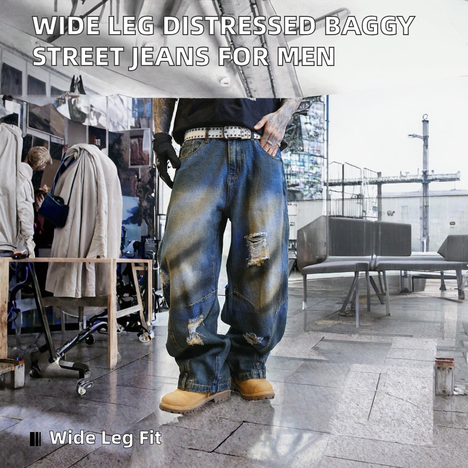 กางเกงยีนส์ขาดๆ สไตล์ลำลอง แฟชั่นฤดูร้อน-ฤดูใบไม้ร่วง ฮิปฮอป กรันจ์ สตรีทแวร์ ทรงหลวม ผู้ชาย ผ้าฝ้าย 100%