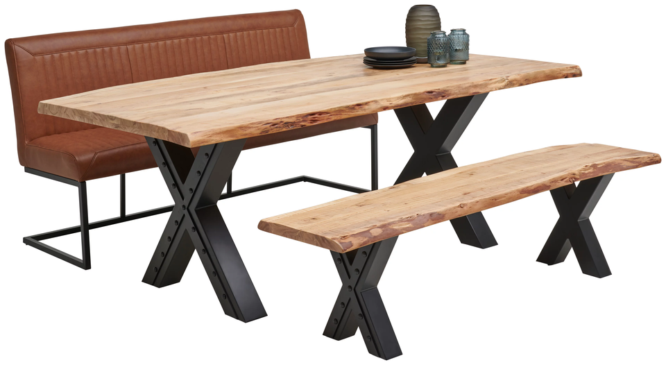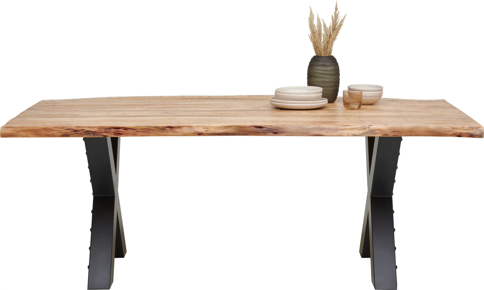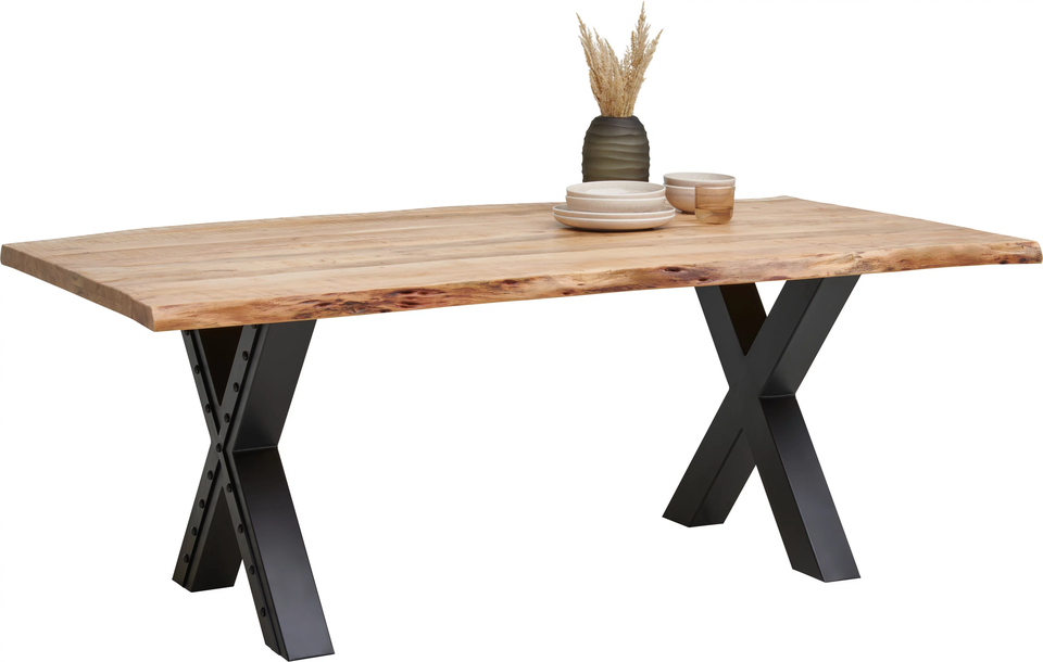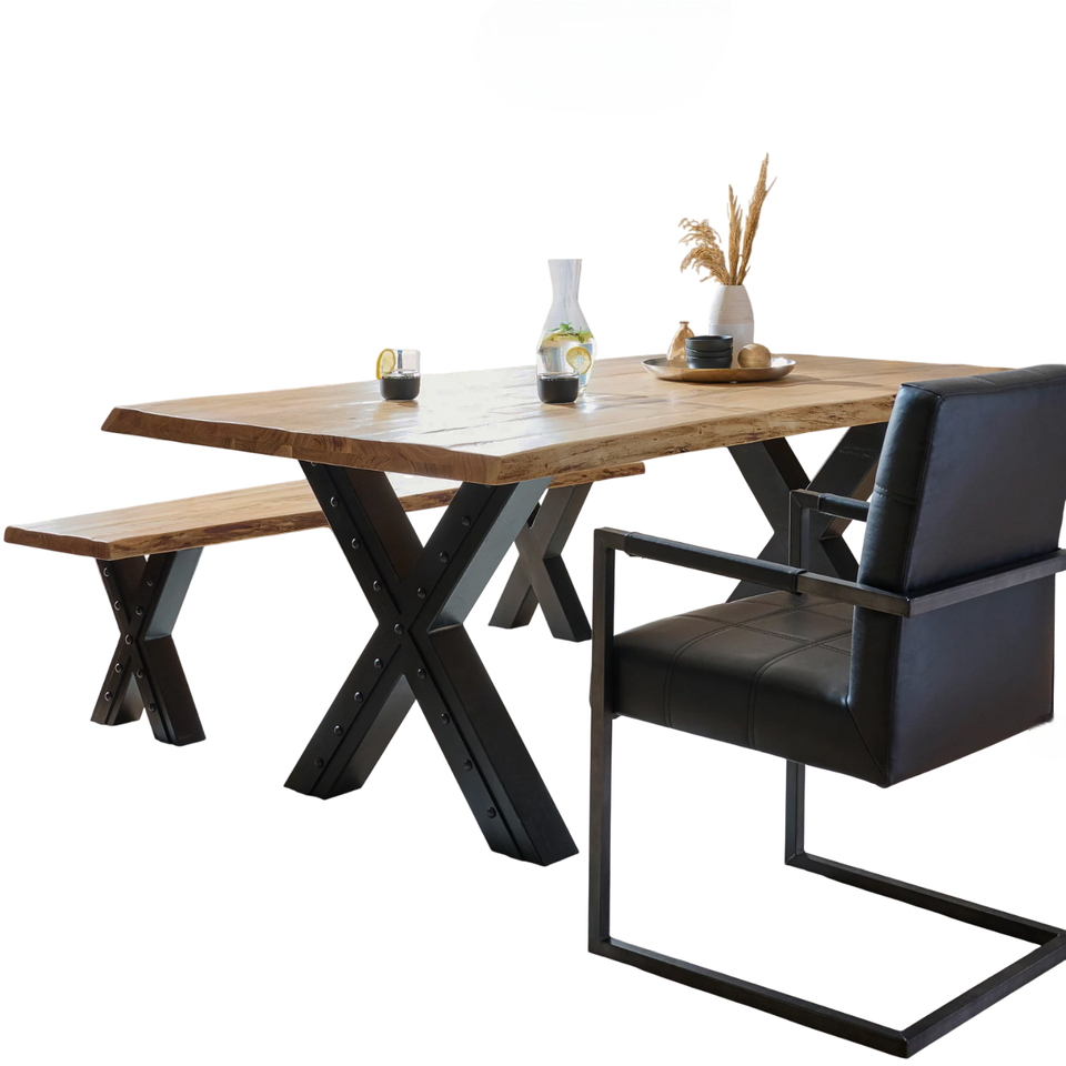 โต๊ะอาหารทรงโมเดิร์นขาเหล็ก X แบบฉีกขาด หน้าโต๊ะไม้เนื้อแข็งอะคาเซียขอบธรรมชาติ สีดำธรรมชาติ เหมาะสำหรับบ้าน ห้องครัว ร้านอาหาร