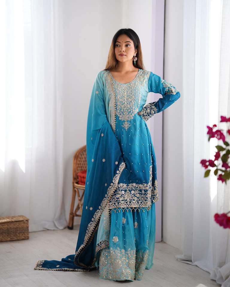 ชุดชาราราสีน้ำเงินแบบหรูหรา พร้อมงานปักลายริเวอร์โมติ ผ้าไหมชิโนน แต่งด้วยดอริ ประดับเลื่อมและริเวตโมติ ท็อปและชาราราพร้อมผ้าคลุมไหล่