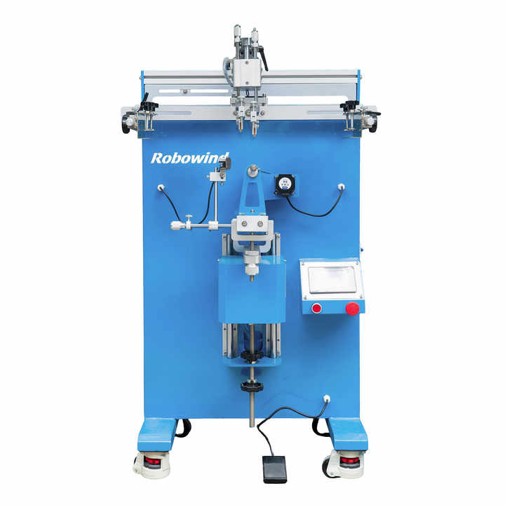 เครื่องพิมพ์สกรีน Robowind กึ่งอัตโนมัติ รุ่นใหม่ ขนาด 10x35 ซม. 1 สถานี 220V พร้อมตะแกรงสแตนเลสทนทานสำหรับการพิมพ์บนทรงกระบอก