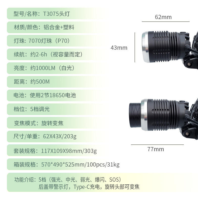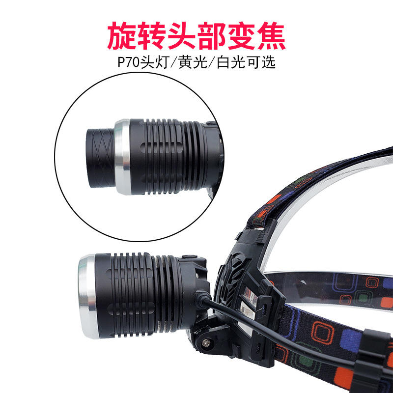 โรมัน ไฮไลท์ส ไฟหน้าแบบ P70 ความจุ 2000 มิลลิแอมป์ ไฟ LED แบบชาร์จได้ ปรับสายรัดได้ อุปกรณ์ให้แสงสว่างสำหรับกิจกรรมกลางแจ้ง