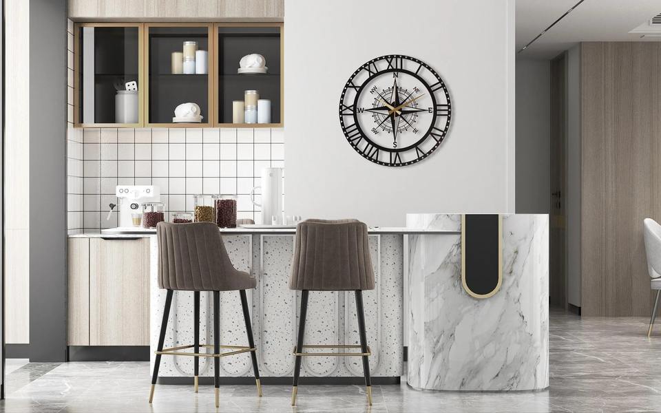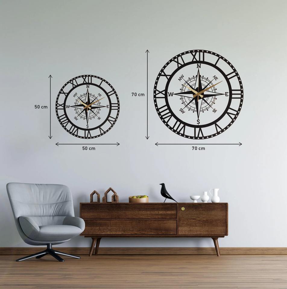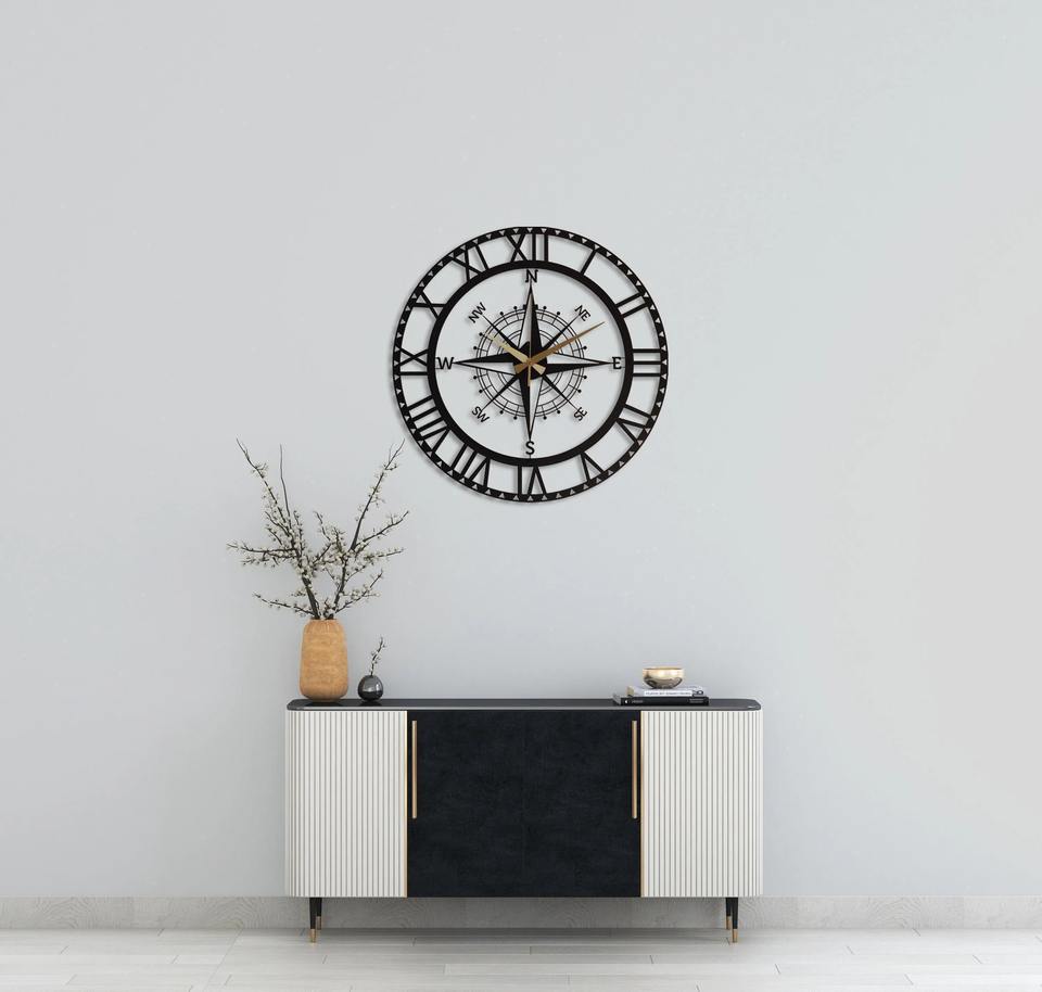 นาฬิกาแขวนผนังโลหะสีดำลายเลขโรมันและเข็มทิศ สำหรับห้องนั่งเล่นและสำนักงาน เพิ่มความโดดเด่นสไตล์วินเทจและแนวทะเล