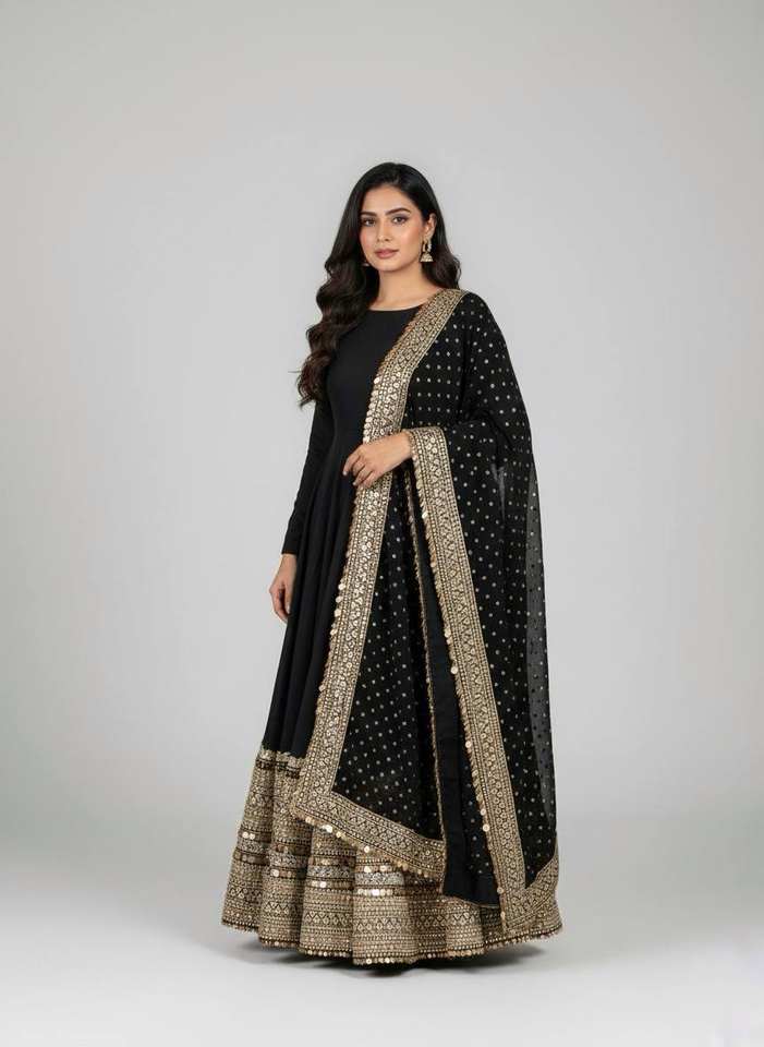 ชุดเดรสอานาร์กาลีผ้าไหมโรมันพร้อมกระโปรงผ้าเครปธรรมชาติและผ้าคลุมไหล่จอร์เจตต์ปักเลื่อม พร้อมสวมใส่ ชุดงานเทศกาลสไตล์ชาติพันธุ์