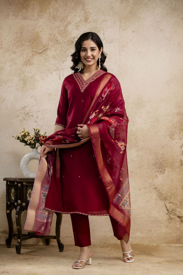 ชุดกางเกง kurti ทำด้วยมือสีม่วงพร้อมการเย็บปักถักร้อยหลายเส้นและผ้าไหม dupatta