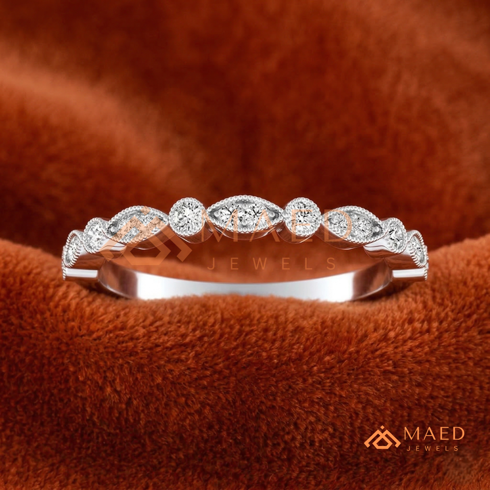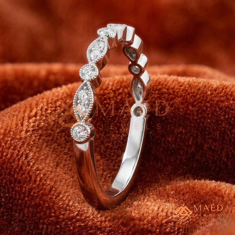 โรแมนติคสีเงิน14K Baguette และแหวนเพชรกลม | สายคาดแต่งงานเพชรที่ปลูกในห้องปฏิบัติการ | เครื่องประดับปรับแต่งได้