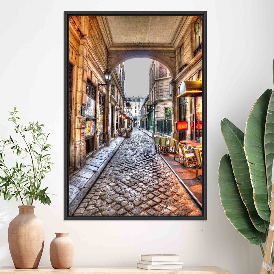 ตรอกหินกรวดแสนโรแมนติก: ภาพพิมพ์บนผ้าใบเพื่อการตกแต่งอย่างหรูหรา ผ้าใบกรอบสีดำ