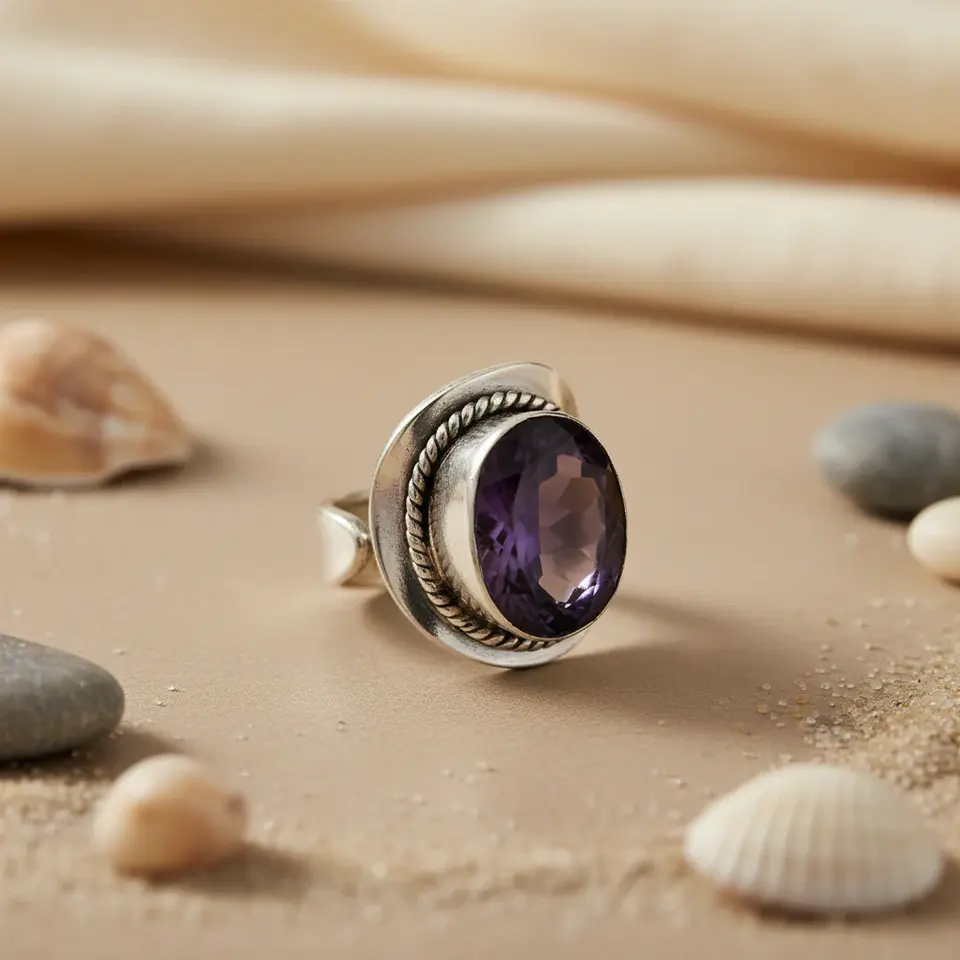 แหวนเงินแท้ 925 ประดับพลอยอะมีทิสต์ธรรมชาติ ดีไซน์โรแมนติกและทันสมัย ชุบทอง 18k
