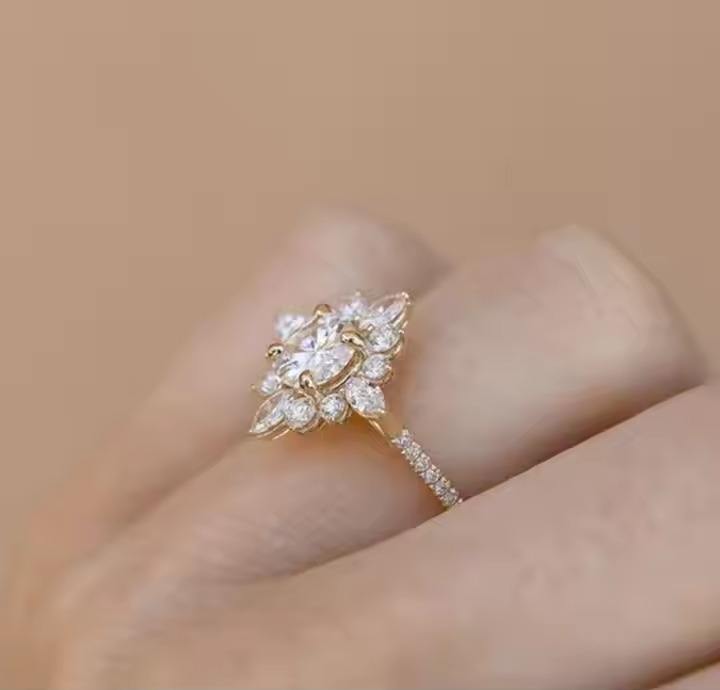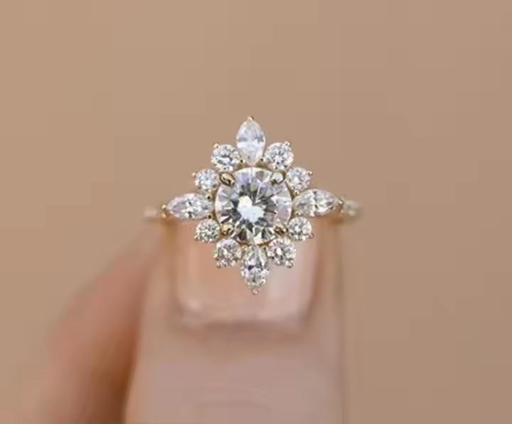 แหวนหมั้นเพชรสำหรับผู้หญิง14K ทรงดอกไม้สุดโรแมนติกแหวนหมั้นเพชรสำหรับผู้หญิงเครื่องประดับทรงโค้งมนสำหรับงานแต่งงานงานปาร์ตี้