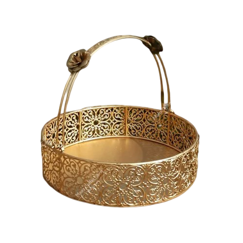 ตะกร้าดอกไม้รูปทรงทองแสนโรแมนติกชิ้นกลางโต๊ะแต่งงานพร้อมที่จับตกแต่งบ้านด้วยเหล็กการจัดโต๊ะแต่งงานที่หรูหรา