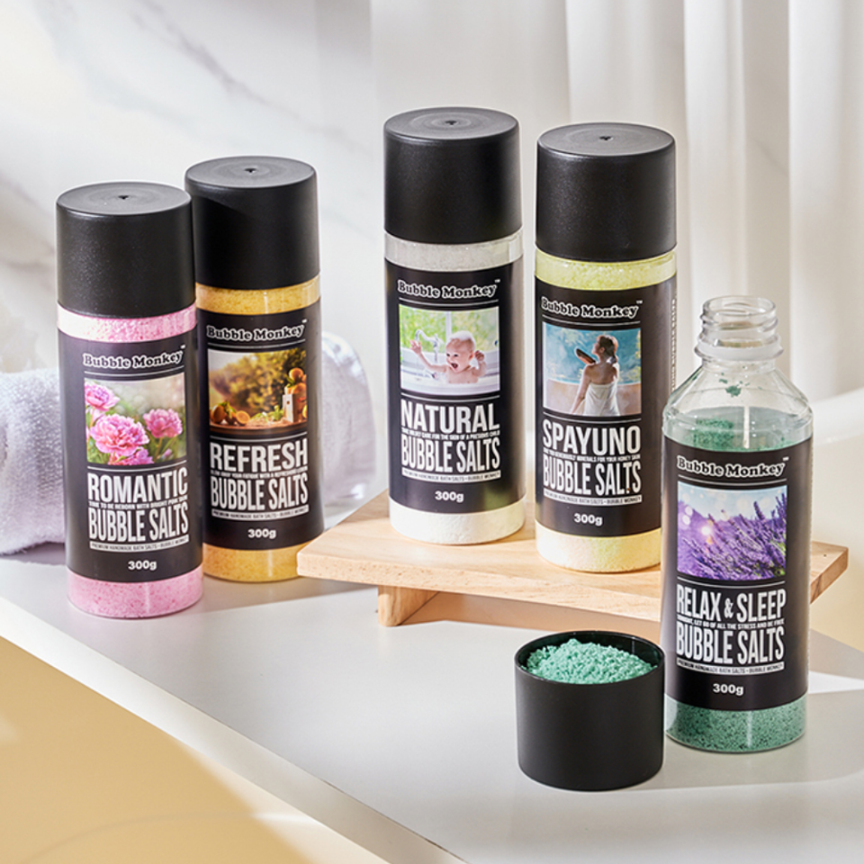 เกลืออาบน้ำหอมกลิ่นมะลิ นม โรส ลาเวนเดอร์ ผสมเกลือหิมาลัย สำหรับผ่อนคลาย ทำความสะอาดผิวกาย แร่ธาตุฟองสบู่ แบรนด์บับเบิ้ลมังกี้
