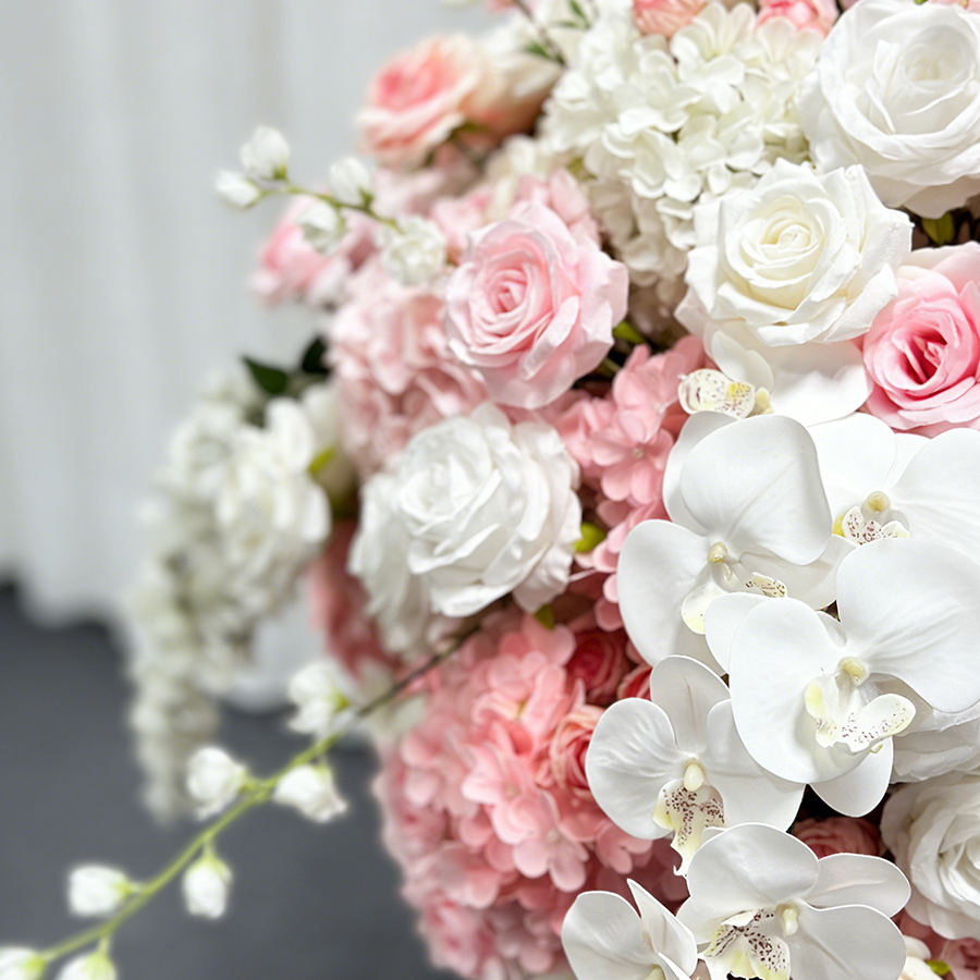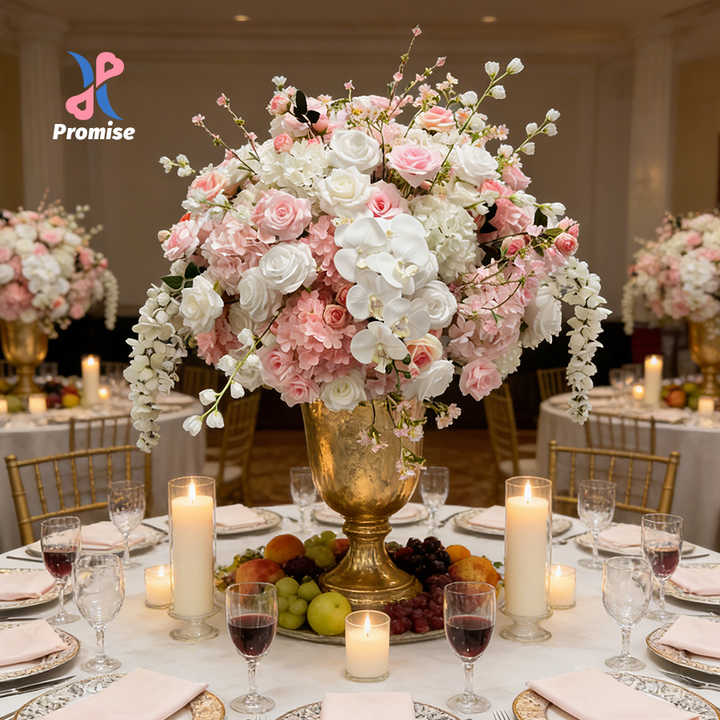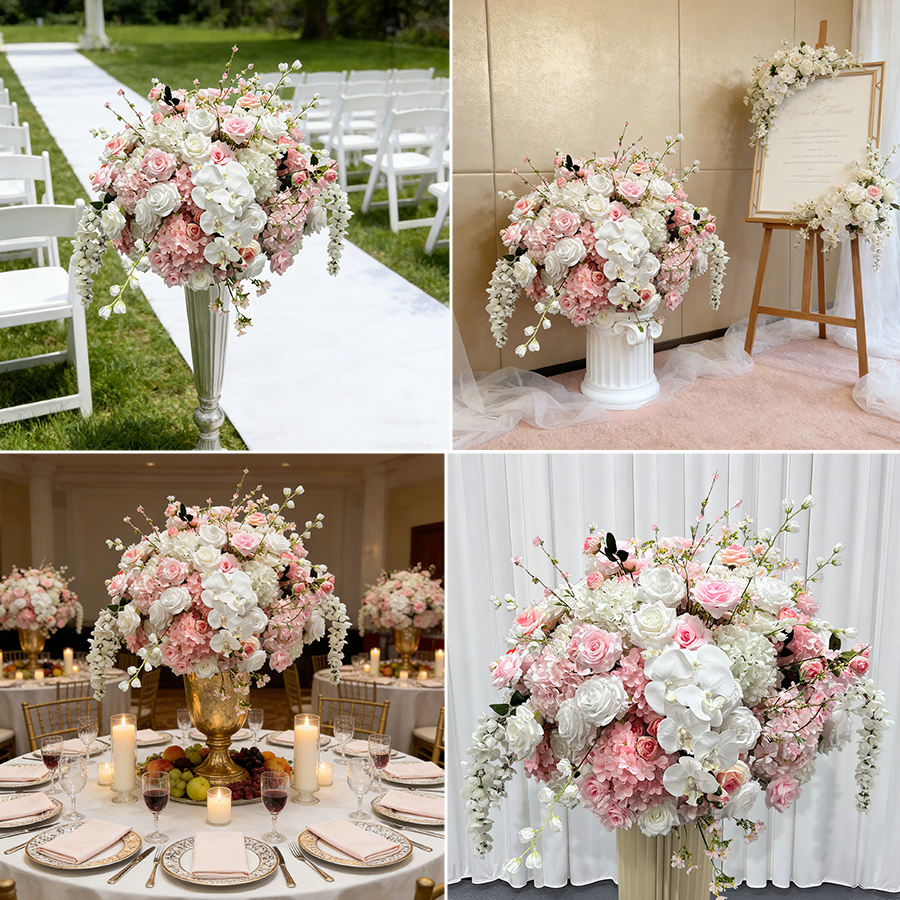 ช่อดอกไม้ประดิษฐ์สีชมพูอ่อนและสีขาวบริสุทธิ์ ทำจากผ้าไหมเนื้อนุ่ม ให้ความรู้สึกโรแมนติกและสมจริง เหมาะสำหรับตกแต่งโต๊ะกลางในงานแต่งงาน