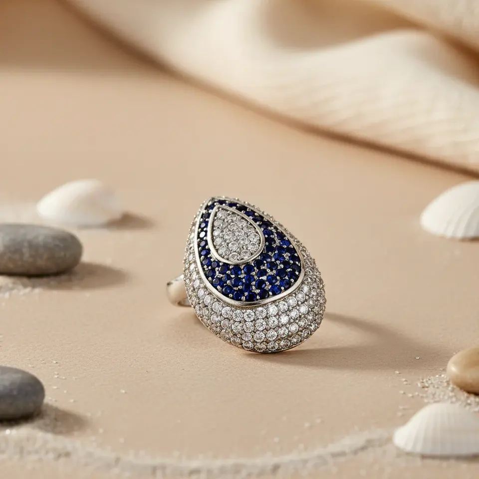 แหวนค็อกเทลเพชรพลอยสีเงินโรแมนติกสำหรับผู้หญิง รูปทรงสี่เหลี่ยมผืนผ้า ลายเรขาคณิต เพชรทรงหยดน้ำสีมรกต ชุบโรเดียม ของขวัญ