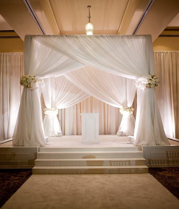ฉากหลังงานแต่งงานกลางแจ้งแบบโรแมนติกพร้อมขาตั้งผ้าม่านสำหรับตกแต่งงานปาร์ตี้