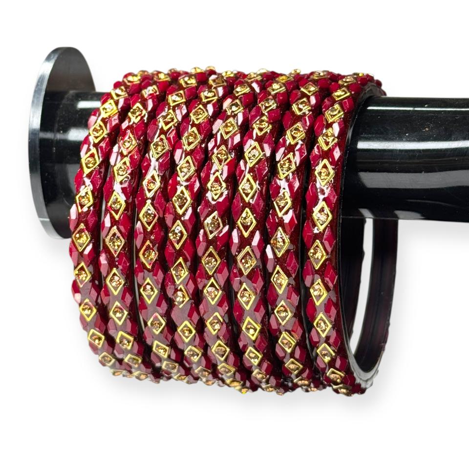 กำไลข้อมือแก้วมุกสีแดงไวน์และสีทองเคลือบทอง ดีไซน์ทันสมัย พร้อมเคลือบเงาและรายละเอียดประณีต