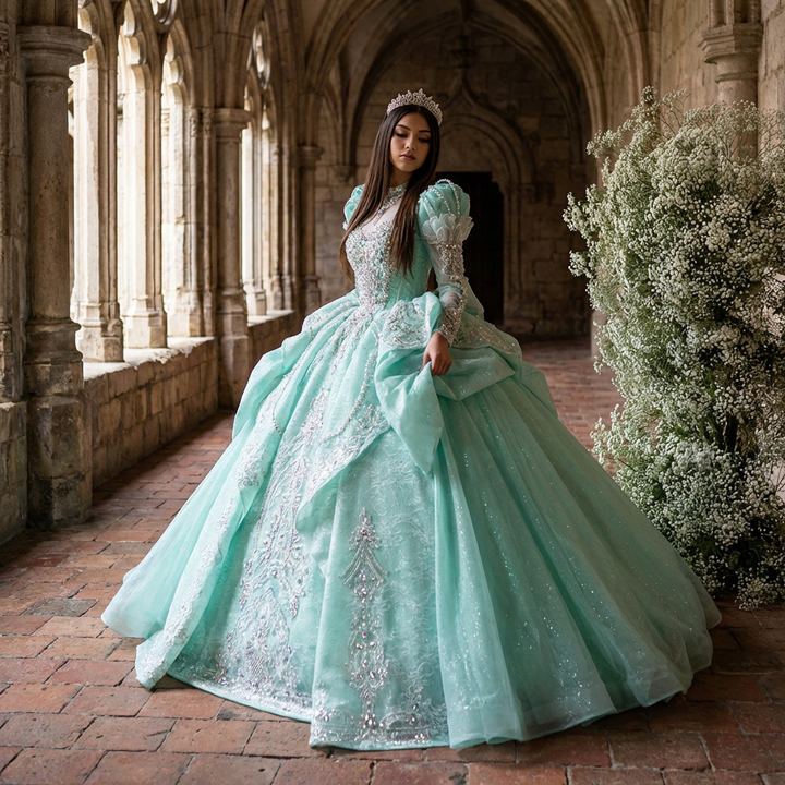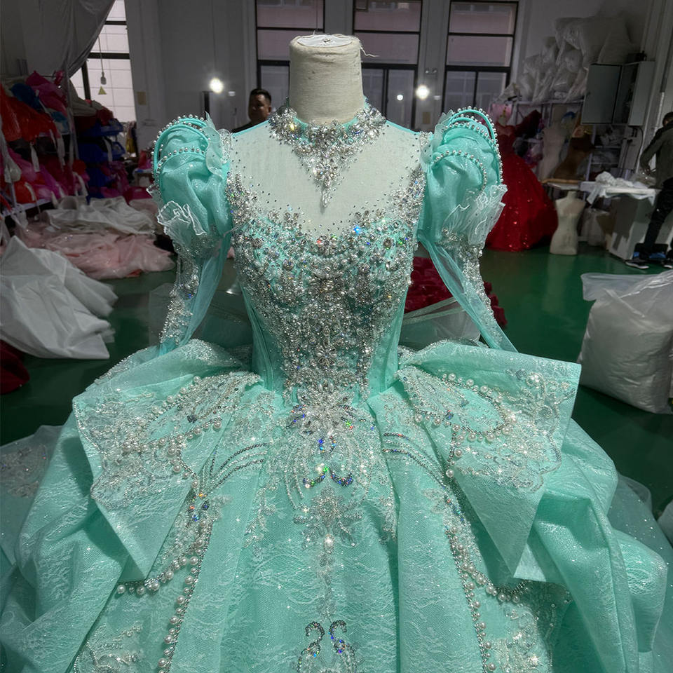 ชุดเดรสงาน Quinceanera สีเขียวเงา ดีไซน์ทันสมัย คอรูปหัวใจ โรแมนติก ประดับลูกไม้ คริสตัล ลูกปัด แบบสั่งตัดได้ รุ่น Xs114