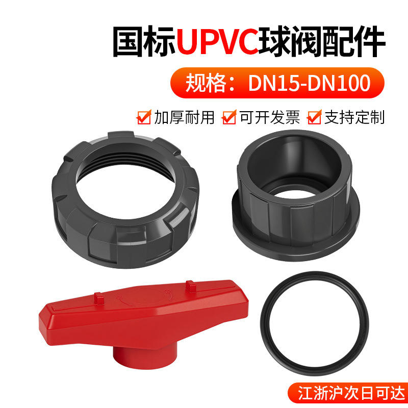 อุปกรณ์วาล์วบอลแบบยูพีวีซีสองทางยี่ห้อ Rongsheng พร้อมน็อตซ็อกเก็ต แหวนรอง และด้ามจับ สำหรับซ่อมแซมและเปลี่ยนวาล์วน้ำท่อพีวีซี