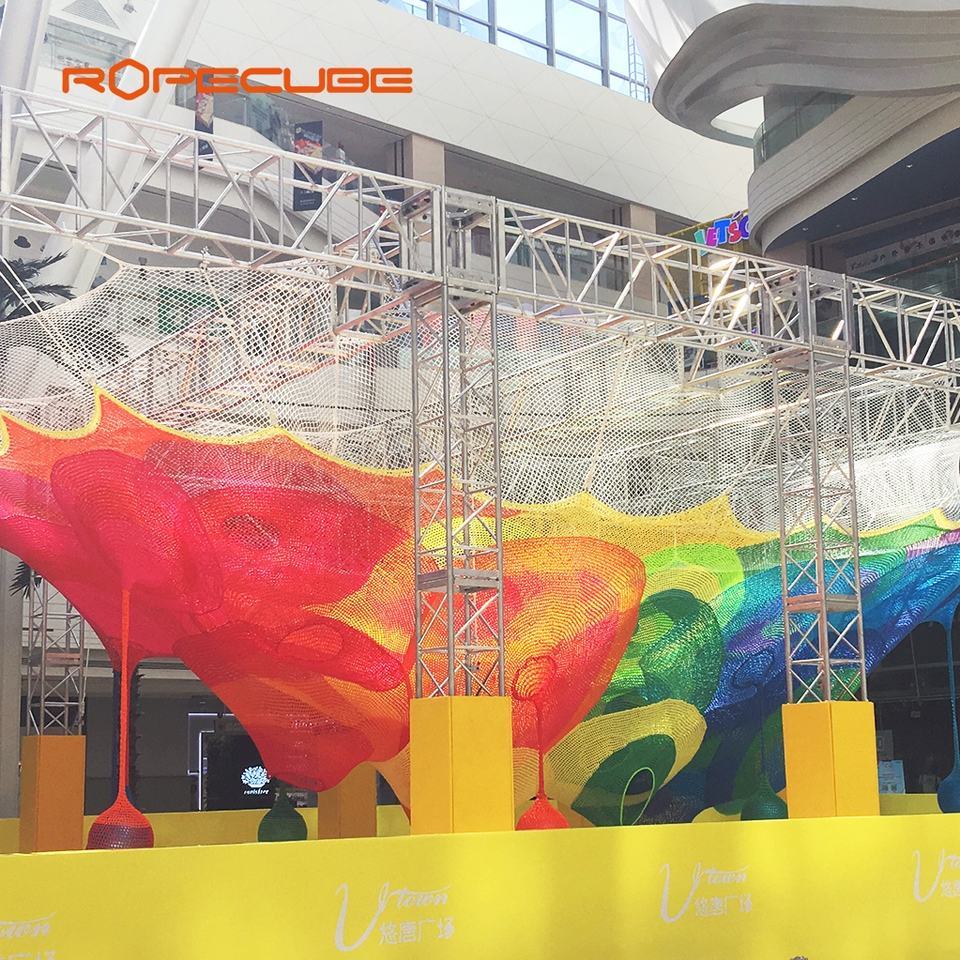 โครงสร้างโครงถักโพลีเอสเตอร์ความทนทานสูง Ropecube ตาข่ายรังผึ้งหลากสีสันแบบเคลื่อนย้ายได้ ศูนย์รวมความบันเทิงสำหรับครอบครัว อุปกรณ์เล่นในร่ม