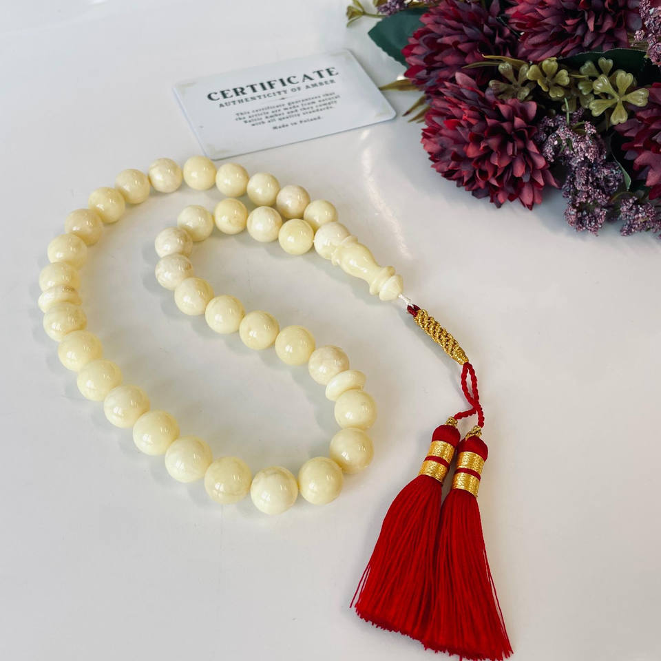 ลูกประคำทำจากอำพันบอลติกธรรมชาติสีขาว ลูกประคำสำหรับสวดมนต์อิสลาม