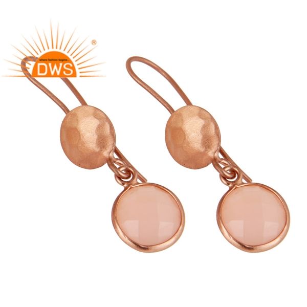 Rose Chalcedony Gemstone Earrings Wholesale Rose Gold Plated Hammered Silver Bezel Set Drop Earrings Jewelry