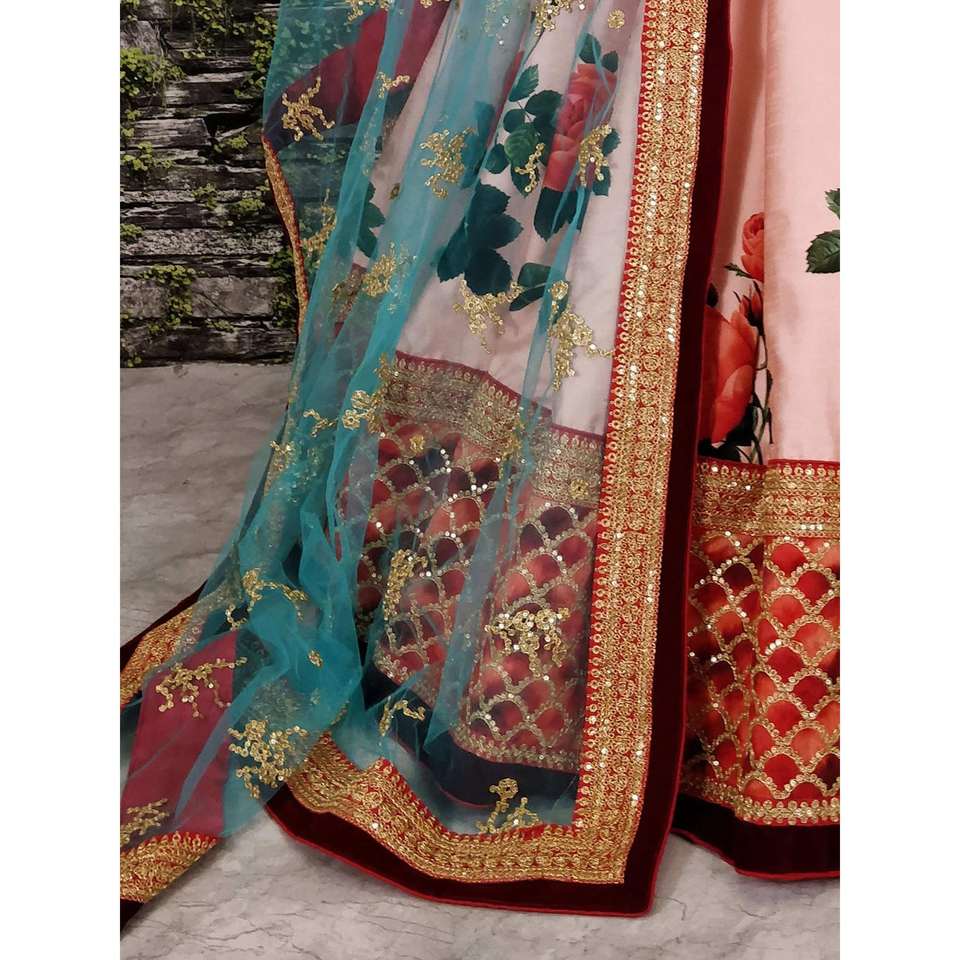 Lehengas นักออกแบบลายดอกกุหลาบพร้อมเสื้อปัก