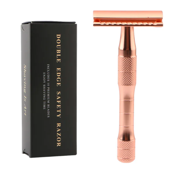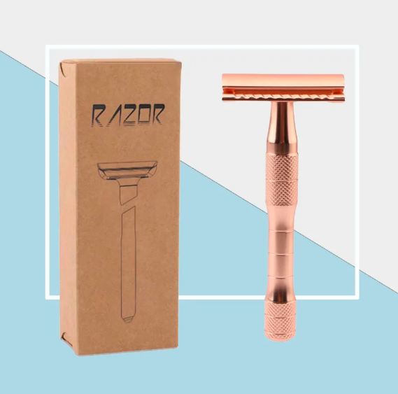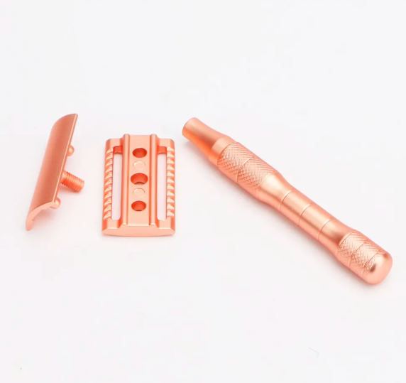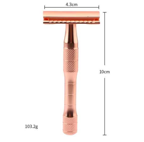 เครื่องโกนหนวดไฟฟ้าแบบโรสโกลด์ใบมีดสองด้านพร้อมด้ามจับทองเหลืองสำหรับกำจัดขนผง