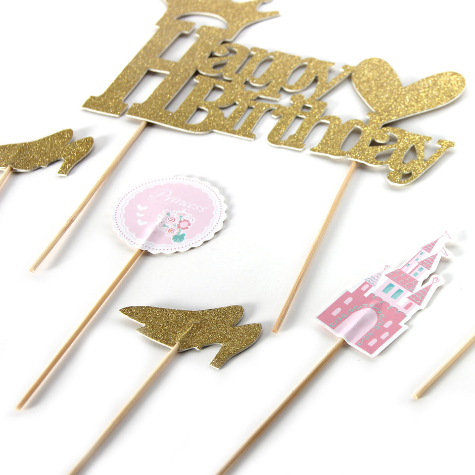 ของตกแต่งหน้าเค้กวันเกิดสีโรสโกลด์พร้อมมงกุฏเค้กวันเกิดเจ้าหญิงสำหรับเด็กผู้หญิงอุปกรณ์งานเลี้ยงวันเกิด