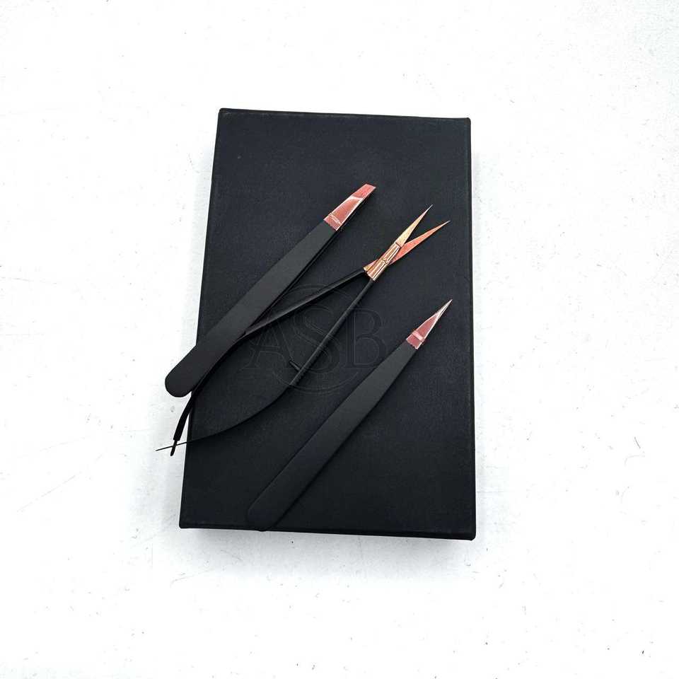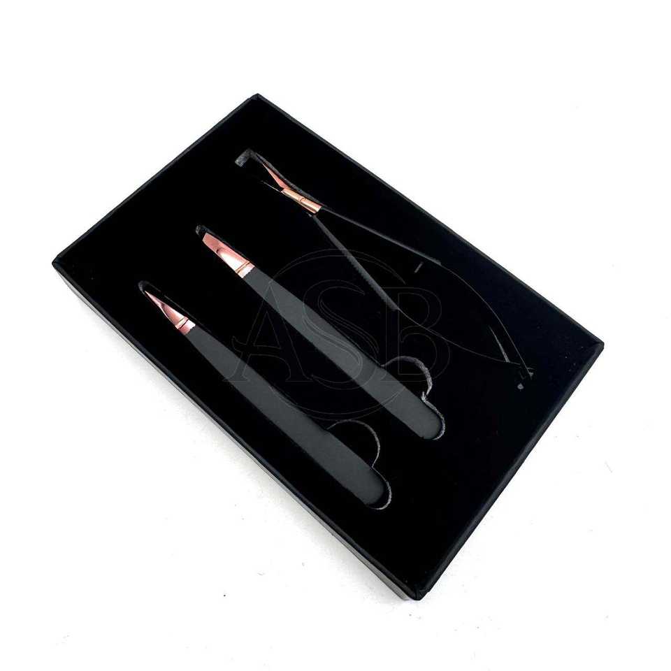 ชุดแหนบถอนขนคิ้วสีโรสโกลด์ดำ พร้อมโลโก้สั่งทำ ปลายเฉียงแหลม พร้อมกรรไกรตัดขนคิ้วแบบสปริงที่ยั่งยืน