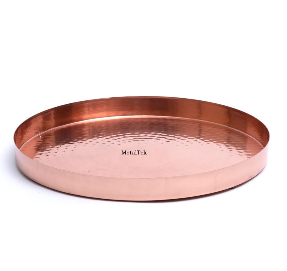 ถาดตกแต่งสีโรสโกลด์ ผิวแบบตอกลาย ทรงกลม ทำจากอะลูมิเนียม สำหรับวางเครื่องสำอาง กาแฟ หรือใช้เป็นถาดเสิร์ฟ
