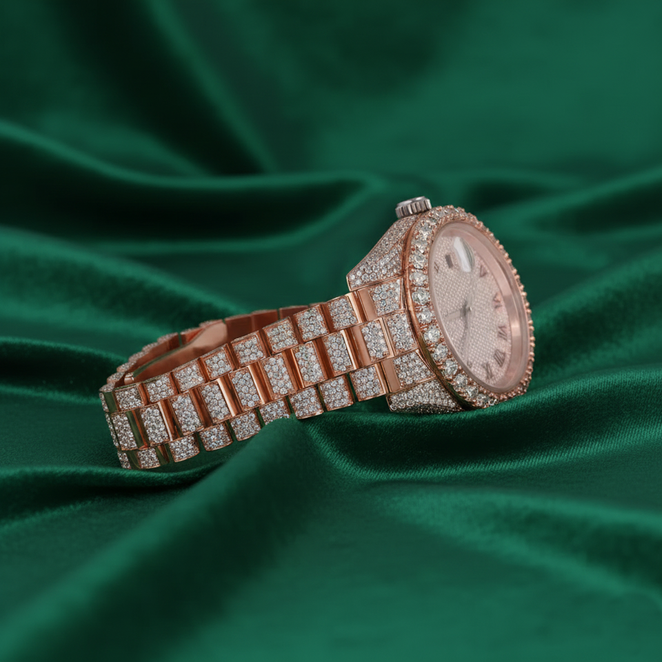 การฝังหิน:ขอบหน้าปัดและสายข้อมือประดับเพชรเต็มรูปแบบ