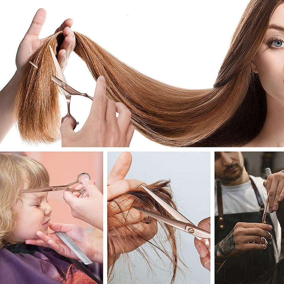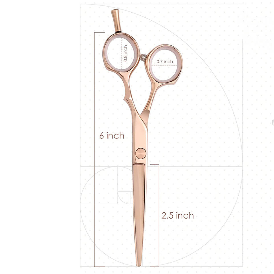 กรรไกรตัดผมสแตนเลสสีโรสโกลด์สำหรับร้านเสริมสวยพร้อมเคสหนัง PU และที่วางนิ้วแบบปรับได้