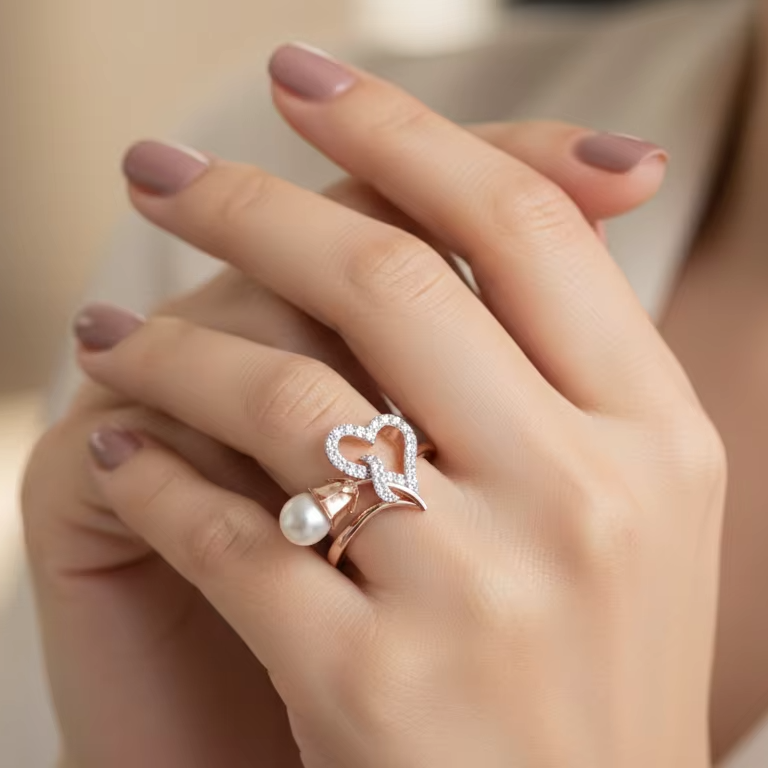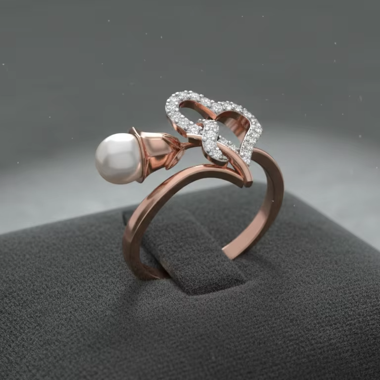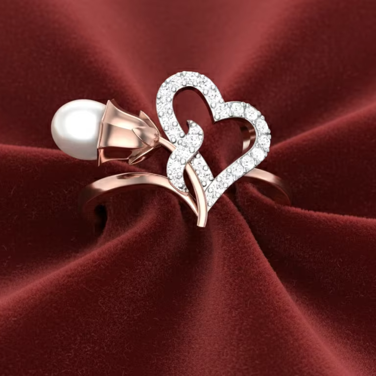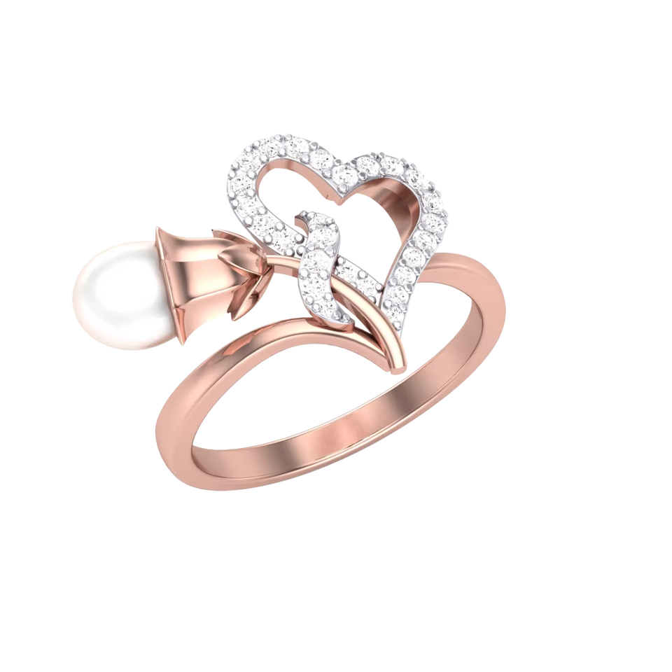 แหวนรูปหัวใจสีโรสโกลด์ประดับมุกและเพชรสำหรับงานแต่งงานและงานหมั้น