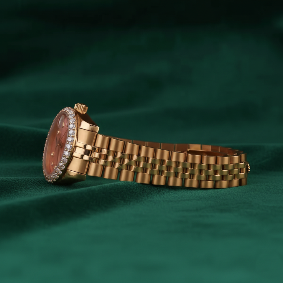 โรสโกลด์ ลักชัวรี วูเมน วอทช์หน้าปัดสีชมพูเพชรกรอบสแตนเลสสตีลควอตซ์กันน้ำนาฬิกาของขวัญสุภาพสตรี
