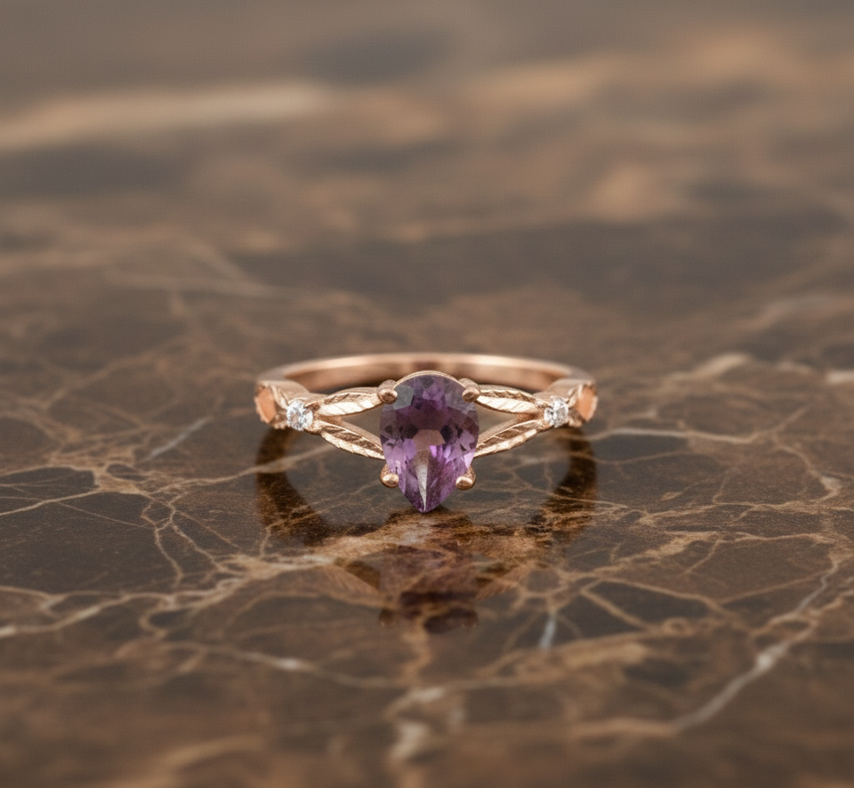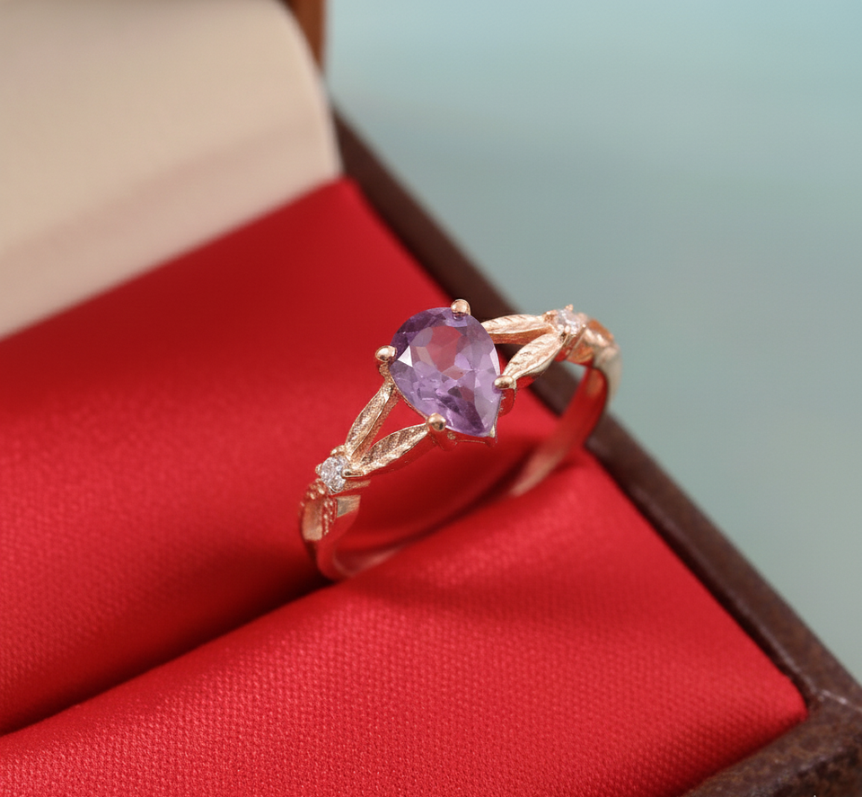 Rose Gold-Plated 925 Sterling Silver Pear Amethyst Gemstone and White CZ Eternity Ring Perfect Boho Classic Style for Birthday