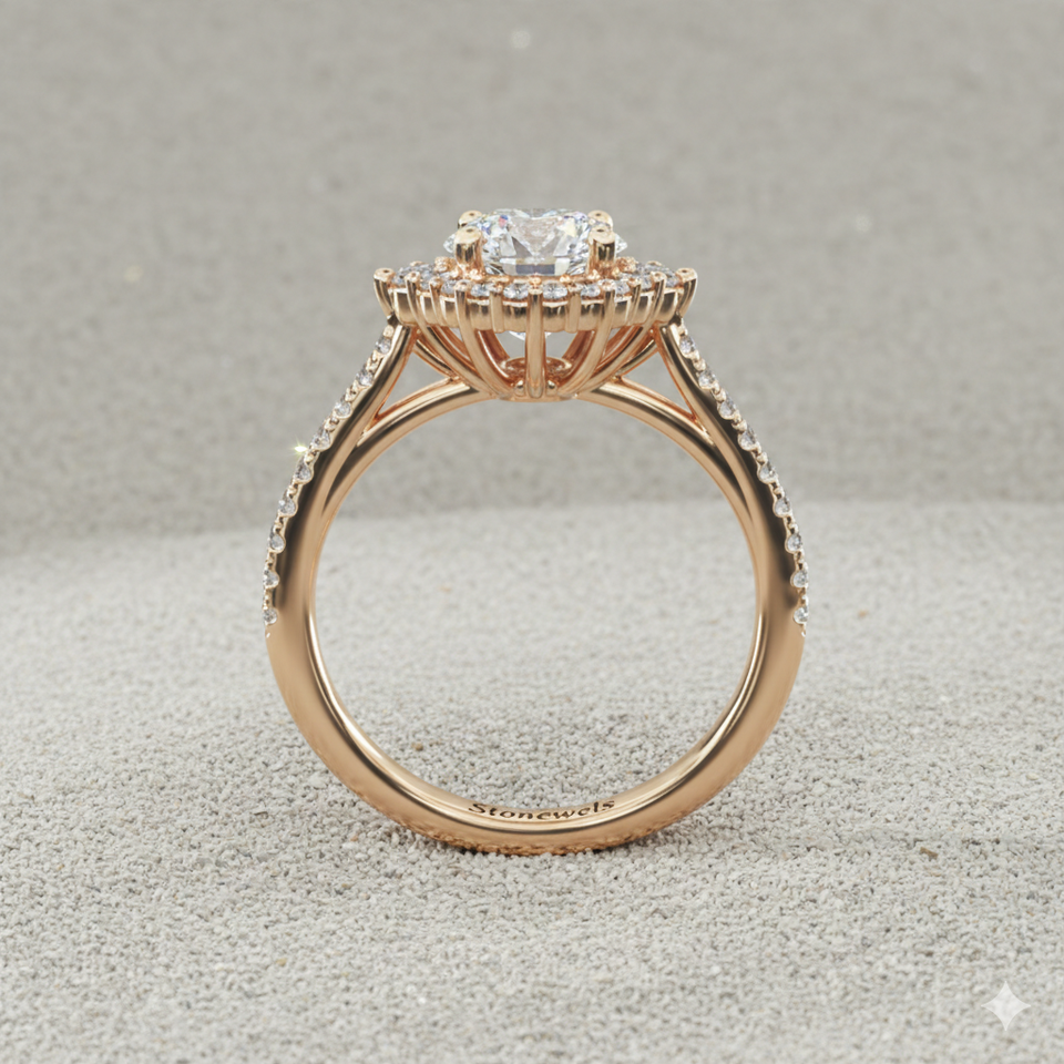 แหวนหมั้นทรงวินเทจประดับเพชรทรงฮาโล่ชุบทองคำสีกุหลาบ