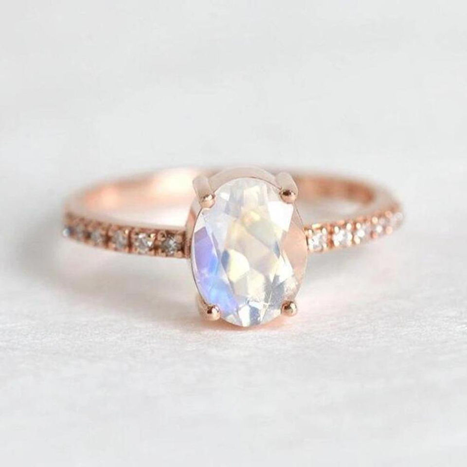 แหวนหมั้นเงินแท้ 925 ชุบทองคำสีโรสโกลด์ ประดับด้วยพลอยมูนสโตนทรงรีเหลี่ยมเพชรพลอย