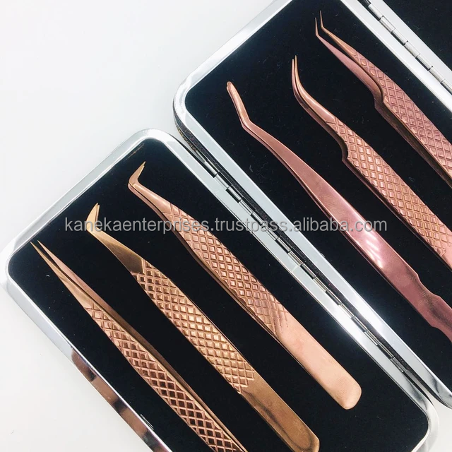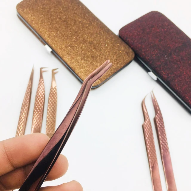 แหนบขนตามืออาชีพสีโรสโกลด์แหนบต่อขนตามาสม่าปลายเส้นใยสแตนเลสปรับแต่งฉลากได้ตามต้องการ