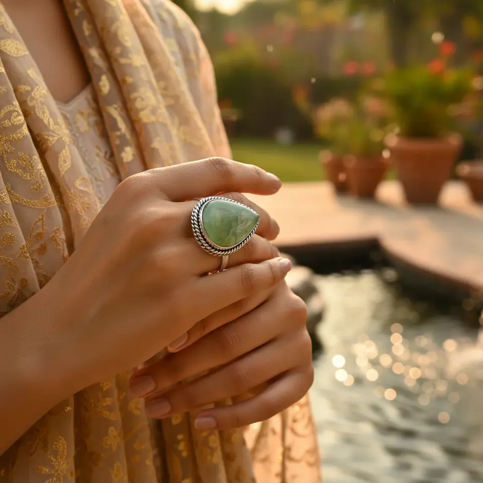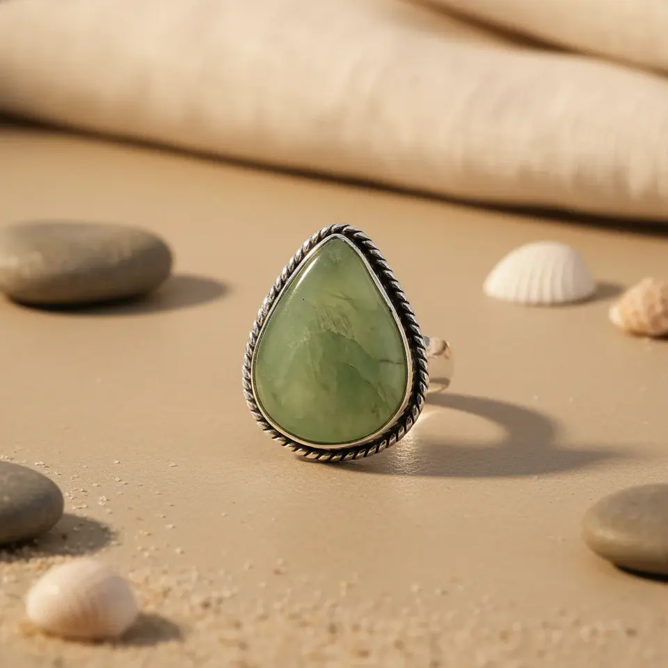 แหวนพลอยสีเขียวทรงหยดน้ำชุบโรสโกลด์และโรเดียมสำหรับผู้หญิง-ดีไซน์คลาสสิก